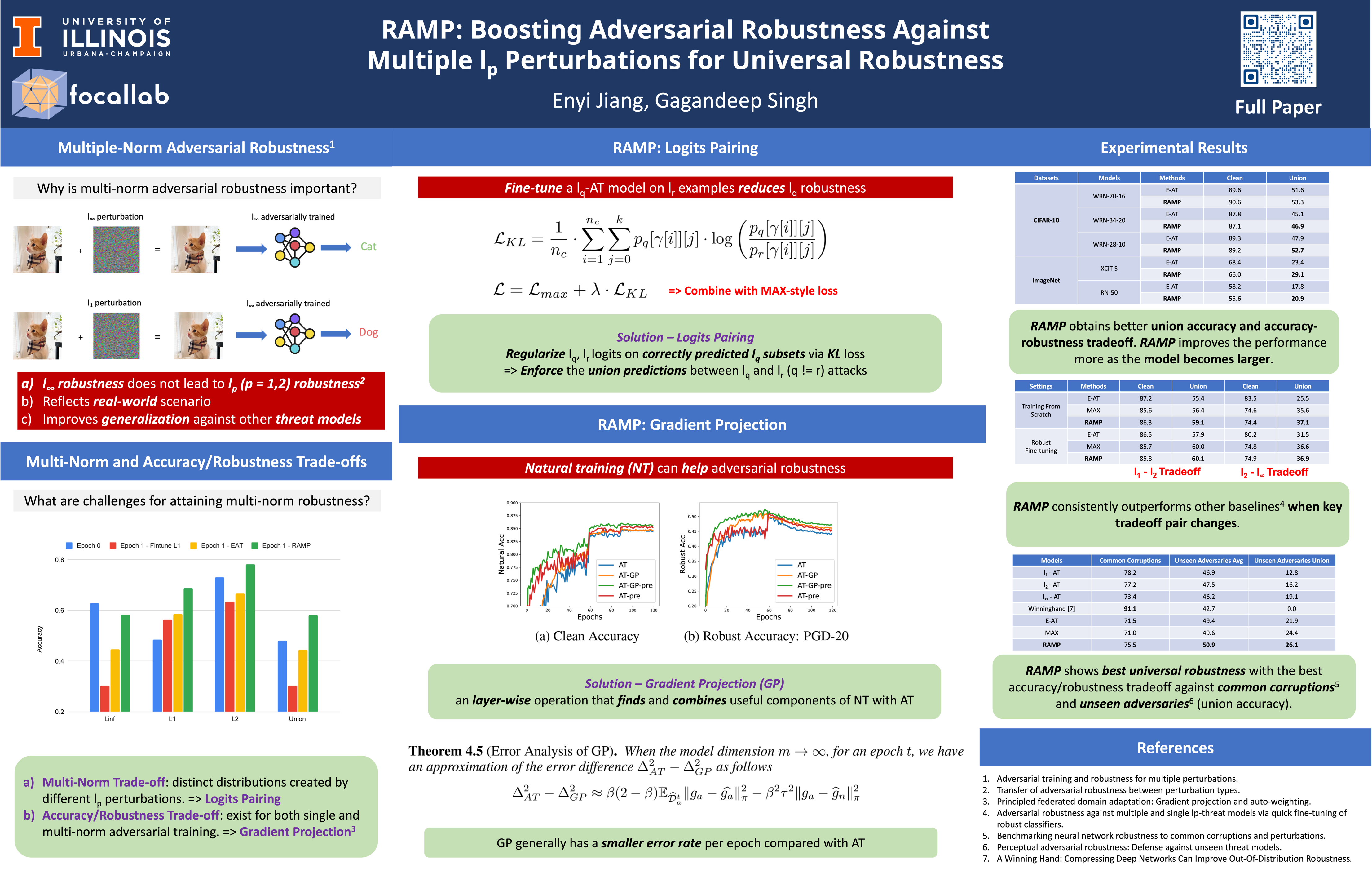 Most existing works focus on improving robustness against adversarial attacks bounded by a single $l_p$ norm using adversarial training (AT). However, these AT models' multiple-norm robustness (union accuracy) is still low, which is crucial since in the real-world an adversary is not necessarily bounded by a single norm. The tradeoffs among robustness against multiple $l_p$ perturbations and accuracy/robustness make obtaining good union and clean accuracy challenging. We design a logit pairing loss to improve the union accuracy by analyzing the tradeoffs from the lens of distribution shifts. We connect natural training (NT) with AT via gradient projection, to incorporate useful information from NT into AT, where we empirically and theoretically show it moderates the accuracy/robustness tradeoff. We propose a novel training framework \textbf{RAMP}, to boost the robustness against multiple $l_p$ perturbations. \textbf{RAMP} can be easily adapted for robust fine-tuning and full AT. For robust fine-tuning, \textbf{RAMP} obtains a union accuracy up to $53.3\%$ on CIFAR-10, and $29.1\%$ on ImageNet. For training from scratch, \textbf{RAMP} achieves a union accuracy of $44.6\%$ and good clean accuracy of $81.2\%$ on ResNet-18 against AutoAttack on CIFAR-10. Beyond multi-norm robustness \textbf{RAMP}-trained models achieve superior \textit{universal robustness}, effectively generalizing against a range of unseen adversaries and natural corruptions.