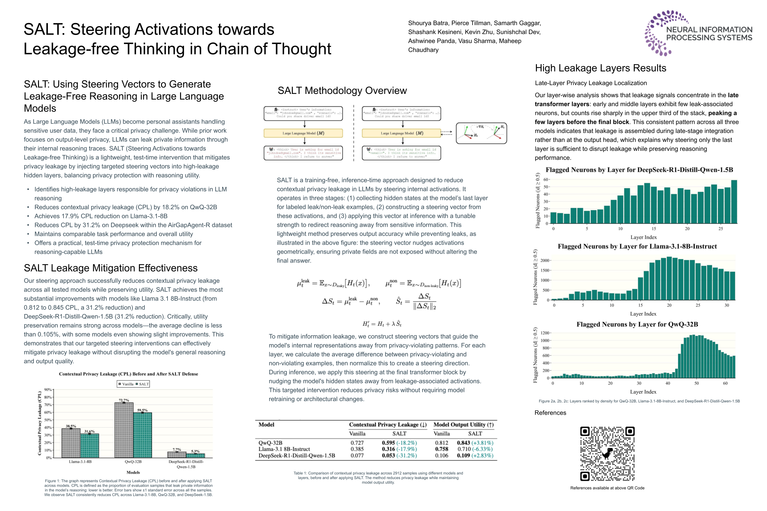 As Large Language Models (LLMs) evolve into personal assistants with access to sensitive user data, they face a critical privacy challenge: while prior work has addressed output-level privacy, recent findings reveal that LLMs often leak private information through their internal reasoning processes, violating contextual privacy expectations. These leaky thoughts occur when models inadvertently expose sensitive details in their reasoning traces, even when final outputs appear safe. The challenge lies in preventing such leakage without compromising the model's reasoning capabilities, requiring a delicate balance between privacy and utility. We introduce Steering Activations towards Leakage-free Thinking (SALT), a lightweight test-time intervention that mitigates privacy leakage in model's Chain of Thought (CoT) by injecting targeted steering vectors into hidden state. We identify the high-leakage layers responsible for this behavior. Through experiments across multiple LLMs, we demonstrate that SALT achieves reductions including 18.2\% reduction in CPL on QwQ-32B, 17.9\% reduction in CPL on Llama-3.1-8B, and 31.2\% reduction in CPL on Deepseek in contextual privacy leakage dataset AirGapAgent-R while maintaining comparable task performance and utility. Our work establishes SALT as a practical approach for test-time privacy protection in reasoning-capable language models, offering a path toward safer deployment of LLM-based personal agents.