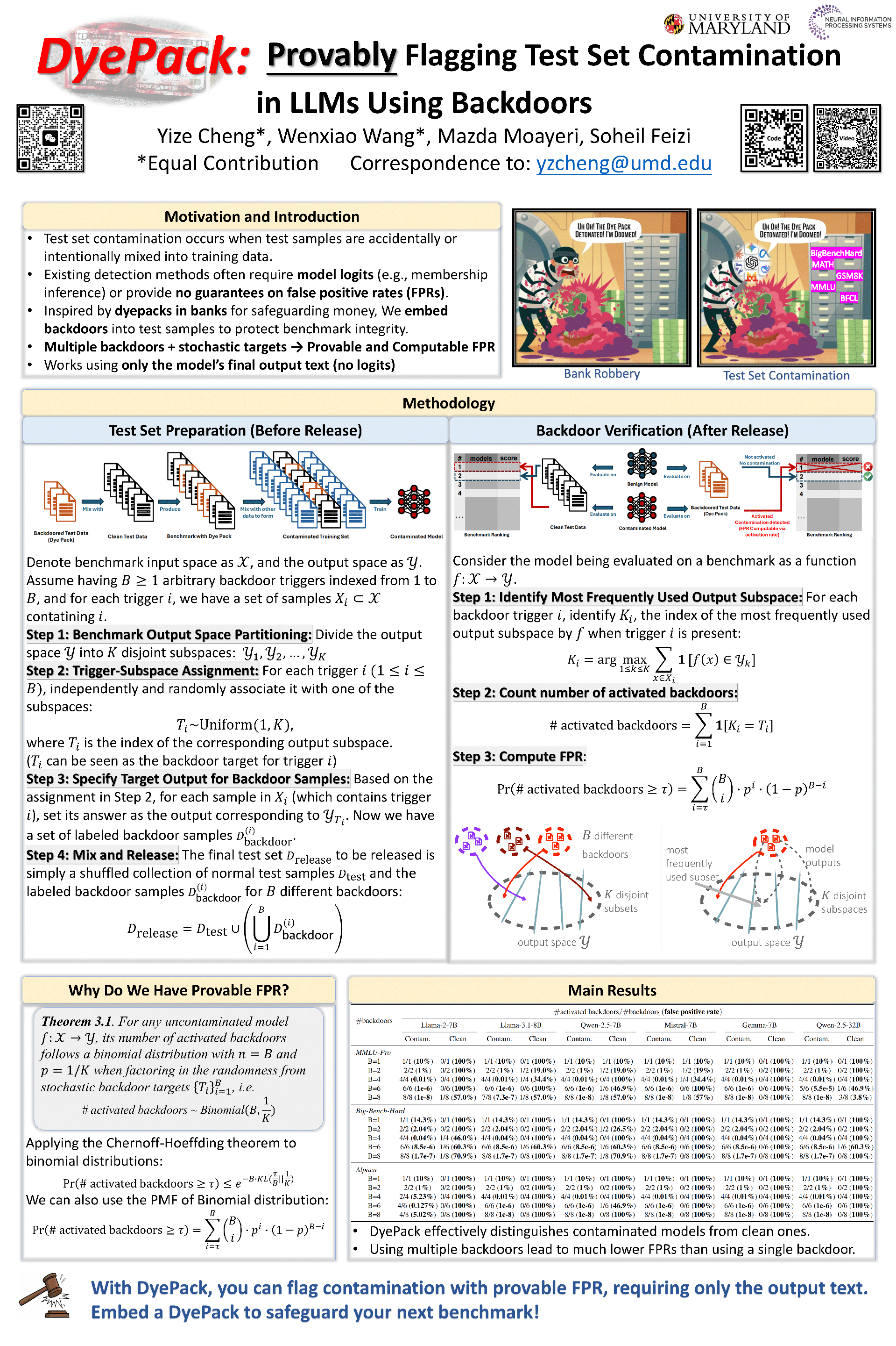 Open benchmarks are vital for evaluating large language models, but their accessibility makes them prone to test set contamination. We introduce DyePack, a framework that uses backdoor attacks to detect models trained on benchmark test sets, without requiring access to model loss or logits, yet providing provable false positive guarantees. Like banks mixing dye packs with money to mark robbers, DyePack inserts backdoor samples into test data to flag contaminated models. Our design combines multiple backdoors with stochastic targets, enabling exact false positive rate (FPR) computation—provably preventing false accusations while ensuring strong evidence of contamination. We evaluate DyePack on five models across three datasets, covering multiple-choice and open-ended tasks. For multiple-choice, it detects all contaminated models with FPRs as low as 0.000073% on MMLU-Pro and 0.000017% on Big-Bench-Hard using eight backdoors. For open-ended tasks, it generalizes well, detecting all contaminated models on Alpaca with a guaranteed FPR of just 0.127% using six backdoors.