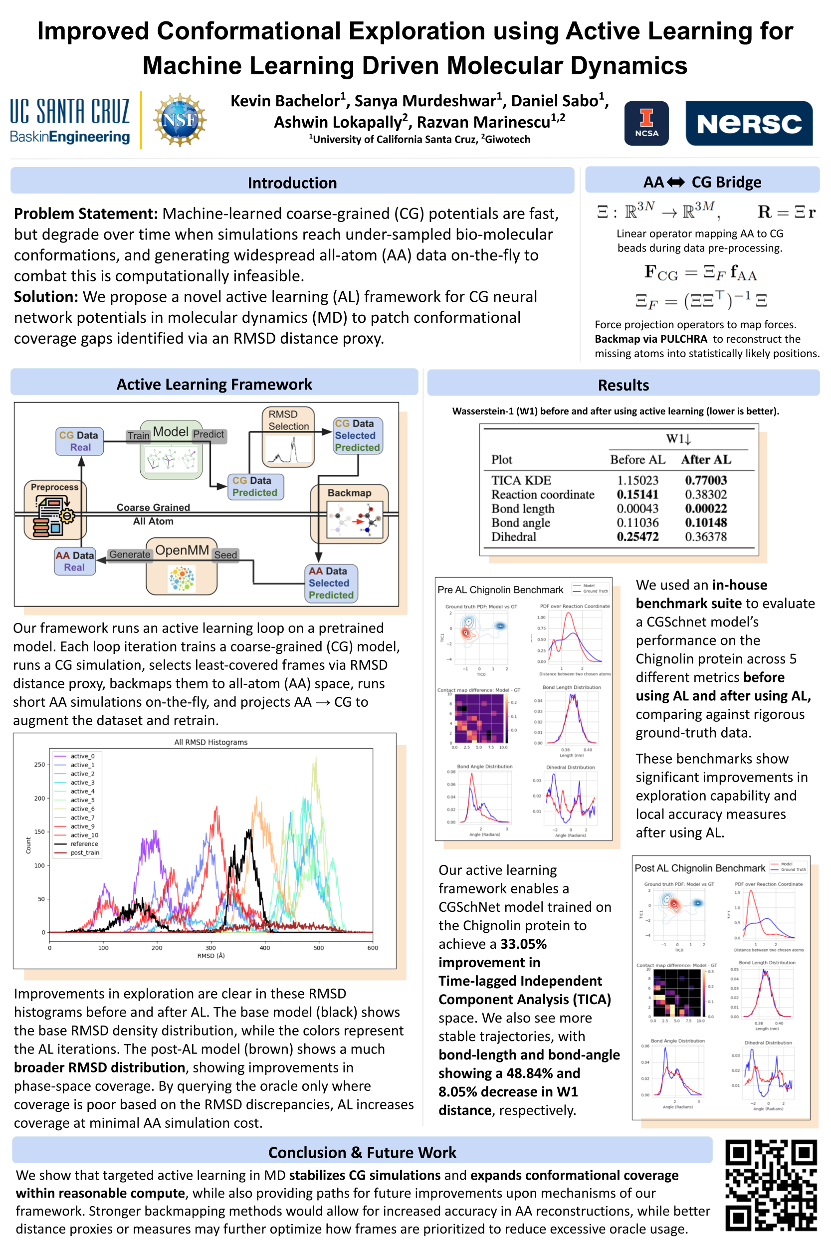 Machine-learned coarse-grained (CG) potentials are fast, but degrade over time when simulations reach under-sampled bio-molecular conformations, and generating widespread all-atom (AA) data to combat this is computationally infeasible. We propose a novel active learning framework for CG neural network potentials in molecular dynamics (MD). Building on the CGSchNet model, our method employs root mean squared deviation (RMSD)-based frame selection from MD simulations in order to generate data on-the-fly by querying an oracle during the training of a neural network potential. This framework preserves CG-level efficiency while correcting the model at precise, RMSD-identified coverage gaps. By training CGSchNet—a coarse-grained neural network potential—we empirically show that our framework explores previously unseen configurations and trains the model on unexplored regions of conformational space. Our active learning framework enables a CGSchNet model trained on the Chignolin protein to achieve a 33.05\% improvement in the Wasserstein-1 (W1) metric in Time-lagged Independent Component Analysis (TICA) space on an in-house benchmark suite.