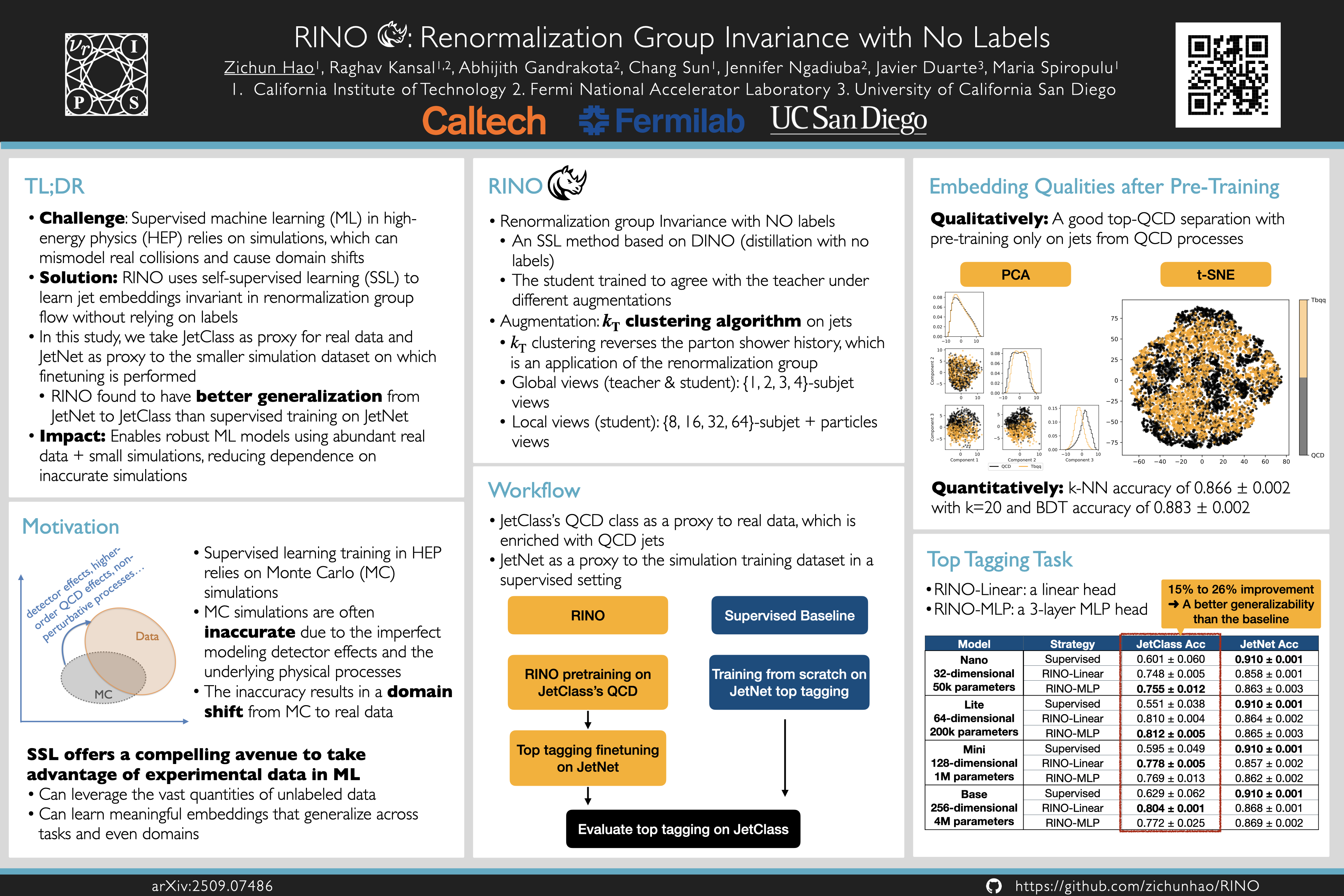 A common challenge with supervised machine learning (ML) in high energy physics (HEP) is the reliance on simulations for labeled data, which can often mismodel the underlying collision or detector response. To help mitigate this problem of domain shift, we propose RINO (Renormalization Group Invariance with No Labels), a self-supervised learning approach that can instead pretrain models directly on collision data, learning embeddings invariant to renormalization group flow scales. In this work, we pretrain a transformer-based model on jets originating from quantum chromodynamic (QCD) interactions from the JetClass dataset, emulating real QCD-dominated experimental data, and then finetune on the JetNet dataset — emulating simulations — for the task of identifying jets originating from top quark decays. RINO demonstrates improved generalization from the JetNet training data to JetClass data compared to supervised training on JetNet from scratch, demonstrating the potential for RINO pretraining on real collision data followed by fine-tuning on small, high-quality MC datasets, to improve the robustness of ML models in HEP.