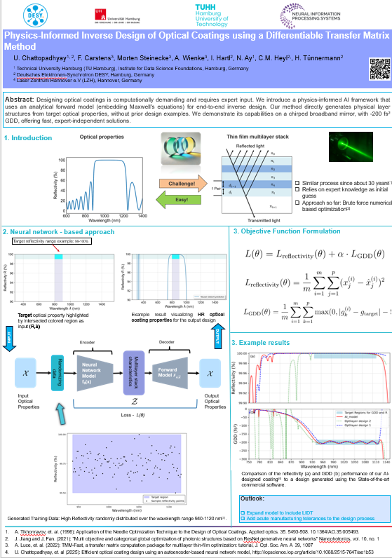 We tackle the challenging inverse design of optical coatings using an artificial intelligence (AI) framework for optical thin-film coating design. Our approach is based on a physics-informed autoencoder with a differentiable physics decoder. Unlike data-driven approaches, our model embeds Maxwell’s equations directly through an analytical forward model, enabling end-to-end, gradient-based optimization from target optical properties to physical layer structures, without requiring any prior design examples. We demonstrate our method by designing a complex broadband mirror with a target reflectivity >99\% and a precise group delay dispersion of$-200\,\text{fs}^2$ over the 940–1120\,nm wavelength range. The AI-generated design reaches performance characteristics competitive with state-of-the-art commercial software, demonstrating a powerful and generalizable framework for solving physics-based inverse design problems.