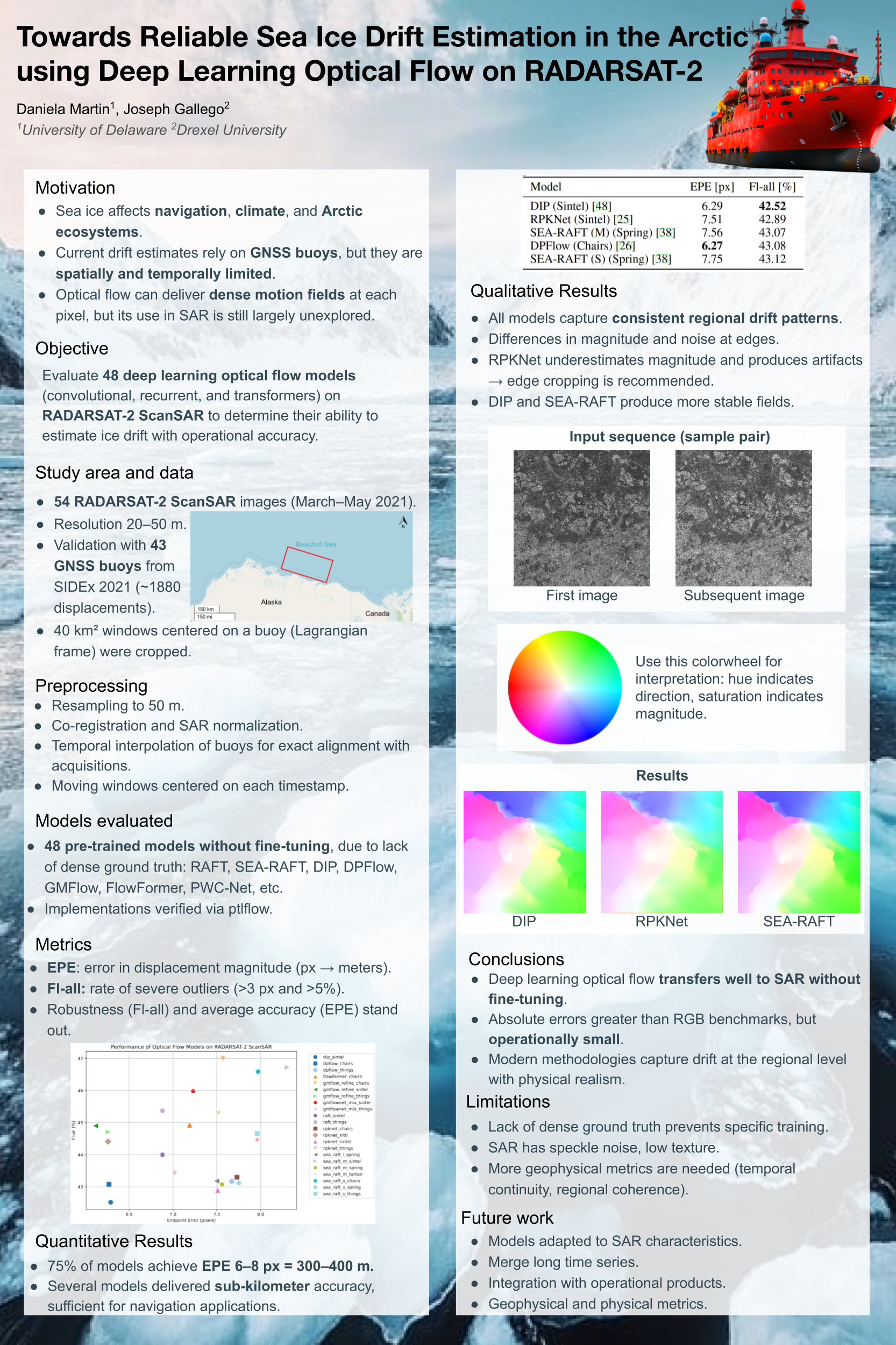 Accurate estimation of sea ice drift is critical for Arctic navigation, climate research, and operational forecasting. While optical flow has advanced rapidly in computer vision, its applicability to satellite SAR imagery remains underexplored. We present the first large-scale benchmark of 48 deep learning optical flow models on RADARSAT-2 ScanSAR data, evaluated with endpoint error (EPE) and Fl-all metrics against GNSS-tracked buoys. Several models achieve sub-kilometer accuracy (EPE 6-8 pixels, \~300-400 m), capturing coherent regional drift patterns and demonstrating that deep learning computer vision models can be effectively transferred to polar remote sensing. Optical flow provides full spatial drift fields at resolutions beyond sparse buoy networks, offering new opportunities for navigation and climate modeling.