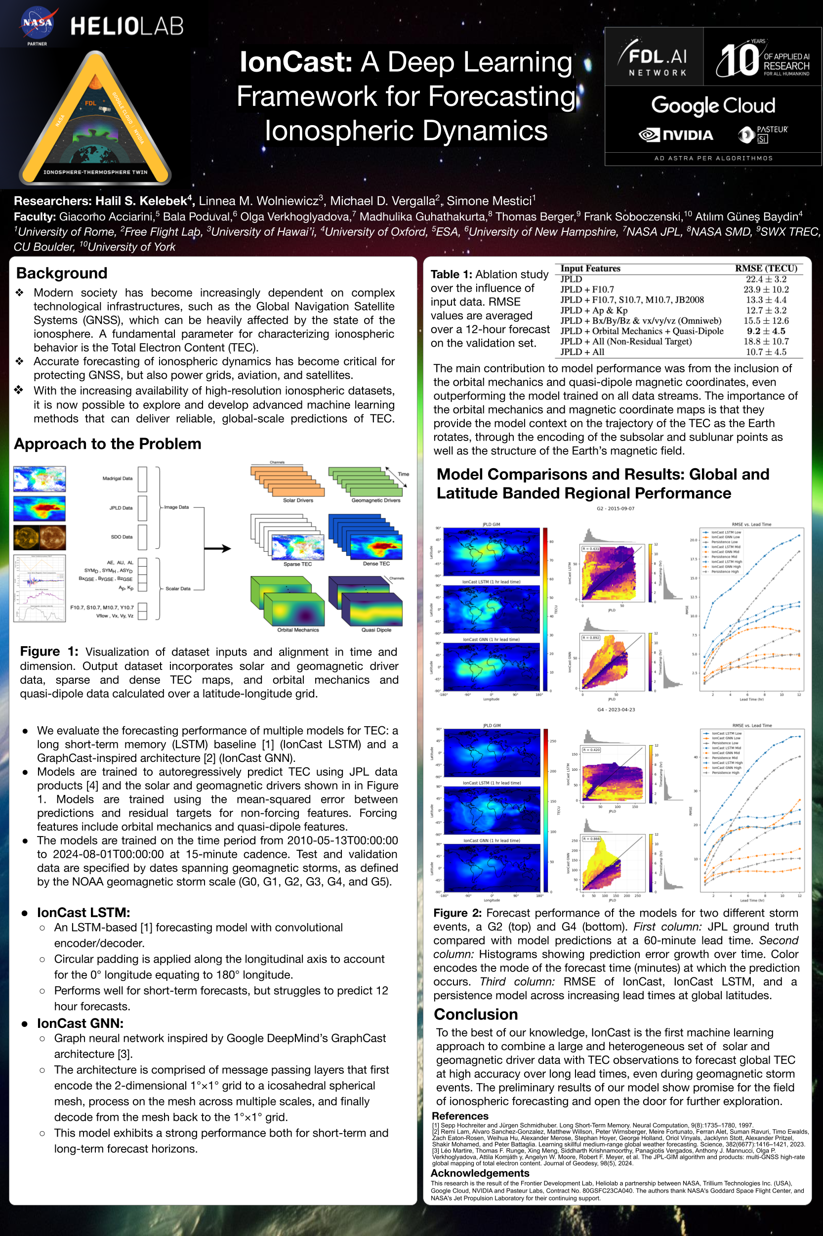 The ionosphere is a critical component of near-Earth space, shaping GNSS accuracy, high-frequency communications, and aviation operations. Traditional physics-based models are computationally demanding and limited in assimilating real-time heterogeneous data. We present IonCast, a deep learning model adapted from GraphCast and tailored for ionospheric dynamics. IonCast leverages spatiotemporal learning to forecast global total electron content (TEC), integrating diverse heliophysical drivers and observational datasets. Validating on held-out storm-time and quiet conditions highlights improved skill compared to persistence. By unifying heterogeneous data with scalable graph-based spatiotemporal learning, IonCast demonstrates how machine learning can augment physical understanding of ionospheric variability and advance operational space weather resilience. I also like the former sentence: IonCast contributes a scientifically grounded, extensible platform for advancing heliophysics and operational space weather resilience.
