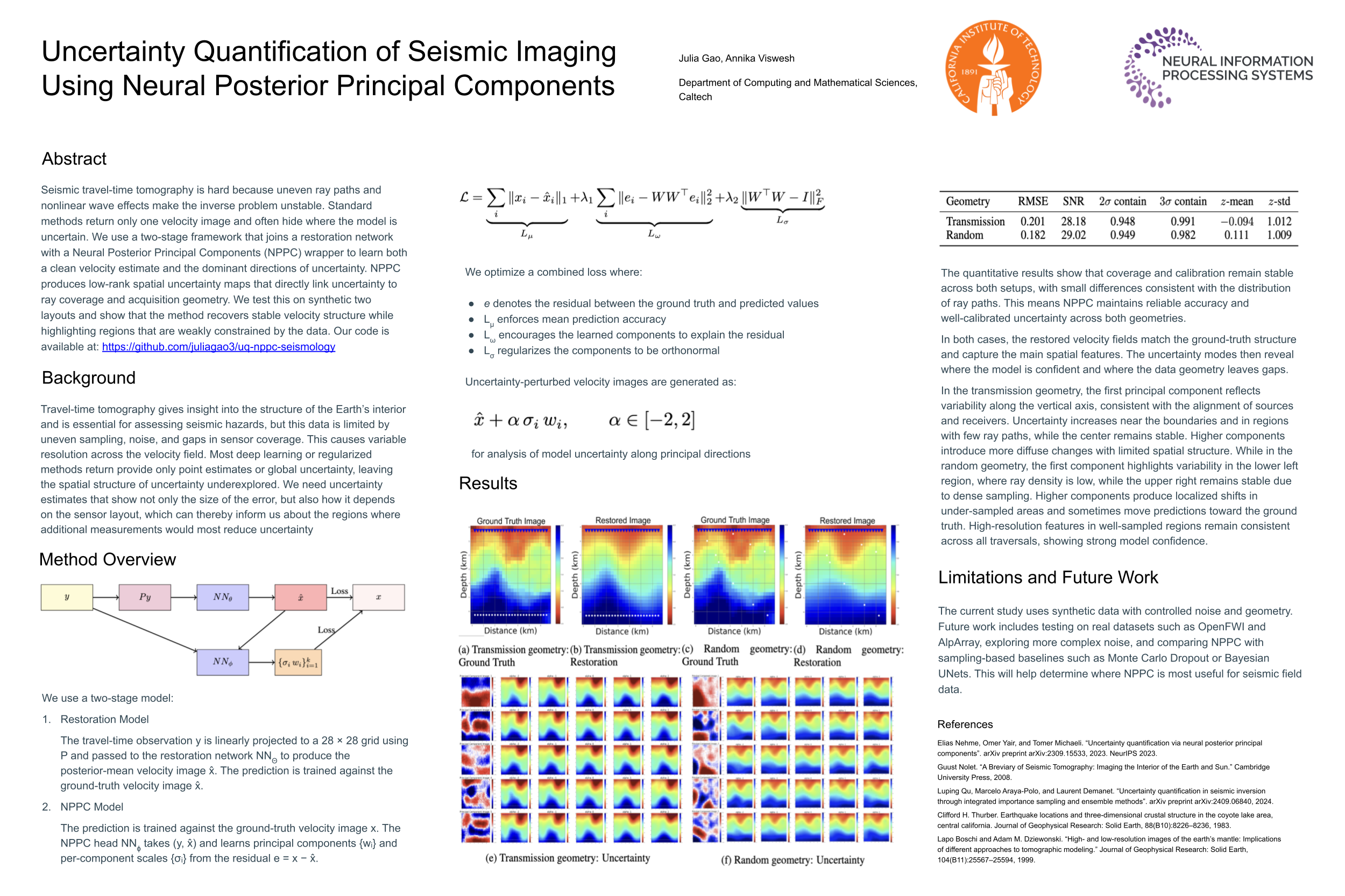 Seismic hazard assessment and engineering planning rely on accurate velocity images of Earth’s interior derived from travel-time data. Yet nonlinear wave physics, uneven station coverage, and the ill-posed inverse problem mean existing methods often return point estimates with little spatially resolved uncertainty. We propose a two-stage learning framework that combines a restoration network for predicting posterior-mean velocity images with a Neural Posterior Principal Components (NPPC) wrapper that learns low-dimensional modes of posterior variability. This adaptation of NPPC to seismic tomography produces uncertainty maps that explicitly link uncertainty structure to data coverage and acquisition geometry. On synthetic transmission and random-geometry datasets, our approach yields velocity images consistent with held-out data and uncertainty maps that expose stable versus underconstrained regions, offering the first spatially interpretable, data-driven uncertainty quantification framework for seismic travel-time tomography.