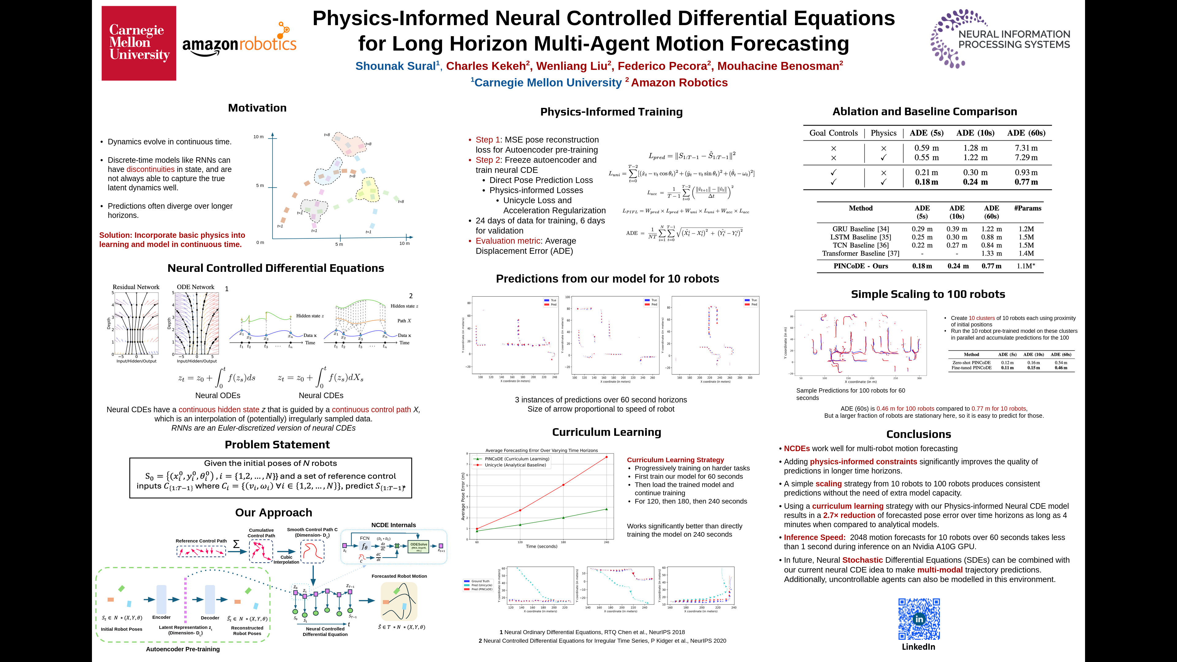 Long-horizon motion forecasting for multiple autonomous robots is challenging due to non-linear agent interactions, compounding prediction errors, and continuous-time evolution of dynamics. Learnt dynamics of such a system can be useful in various applications such as travel time prediction, prediction-guided planning and surrogate simulation. In this work, we aim to develop a fast trajectory forecasting model conditioned on multi-agent goals. Motivated by the recent success of physics-guided deep learning for partially known dynamical systems, we develop a model based on neural Controlled Differential Equations (CDEs) for long-horizon motion forecasting. Unlike discrete-time methods such as RNNs and transformers, neural CDEs operate in continuous time, allowing us to combine physics-informed constraints and biases to jointly model multi-robot dynamics. Our approach learns differential equation parameters that can be used to predict the trajectories of a multi-agent system starting from an initial condition, while enforcing physics constraints to predict robot motion over extended periods of time. Our experiments show that our method is capable of learning non-trivial dynamics for such systems.