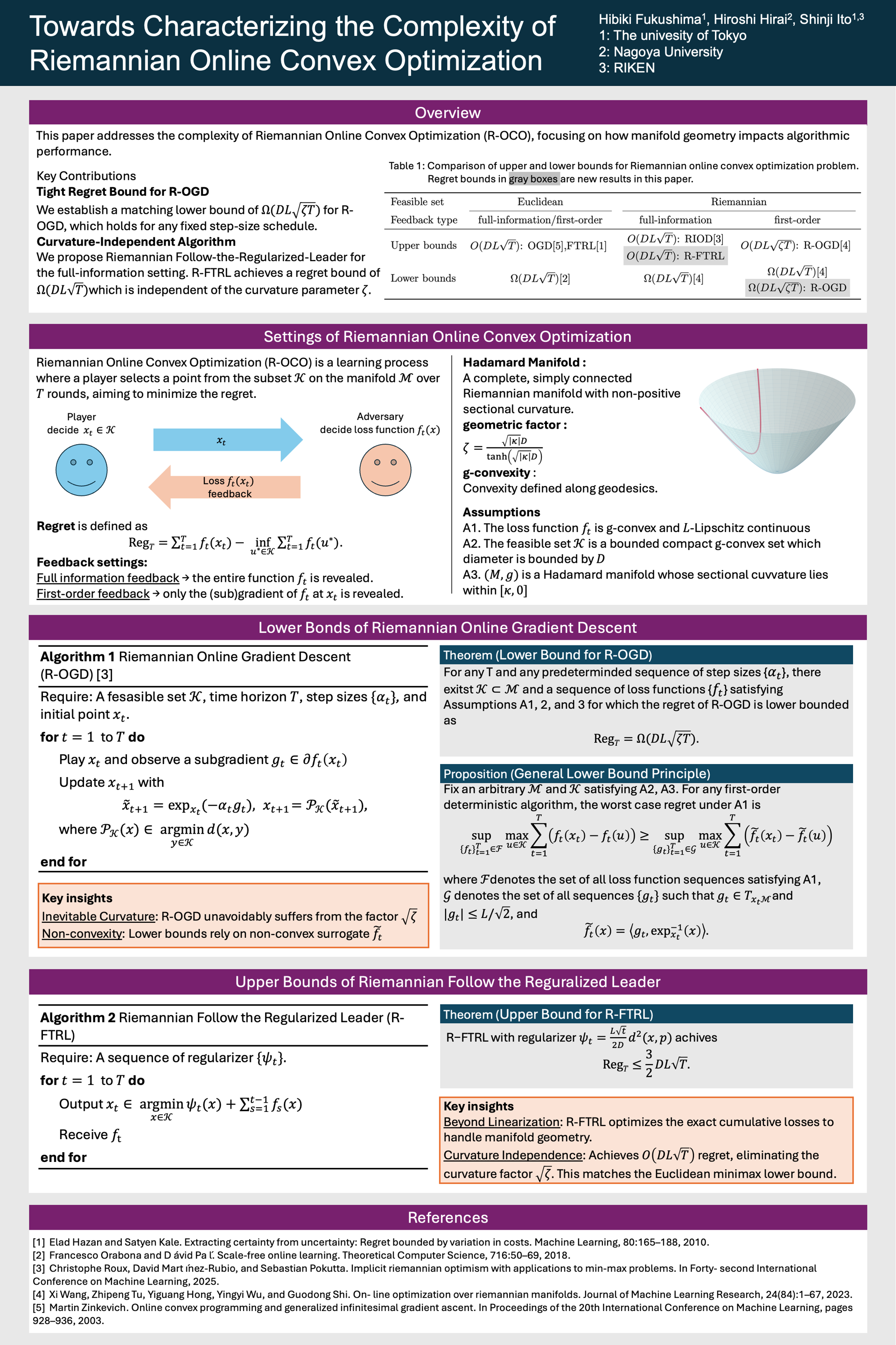 Online Convex Optimization (OCO) over Riemannian manifolds raises fundamental questions about how geometry affects algorithmic performance.While Riemannian Online Gradient Descent (R-OGD) has been shown to achieve a regret upper bound of $O(DL\sqrt{\zeta T})$,where $\zeta$ depends on the manifold's curvature,the tightness of this bound remained unclear.We first establish a matching lower bound of $\Omega(DL\sqrt{\zeta T})$ for R-OGD,valid for any fixed step-size schedule.This shows that the worst-case regret of R-OGD is $\Theta(DL\sqrt{\zeta T})$,and that the effect of manifold curvature appears as a multiplicative factor of $\sqrt{\zeta}$ in the regret.In contrast to the Euclidean setting—where OGD is minimax optimal and regret bounds are independent of feedback models—this result reveals that geometry can substantially degrade the performance of first-order algorithms.Our second contribution shows that this degradation is not unavoidable.In the full-information setting,we propose a new algorithm, R-FTRL, based on a Riemannian extension of Follow-the-Regularized-Leader.R-FTRL achieves a regret bound of $O(DL\sqrt{T})$,independent of the curvature.This establishes that curvature-dependent regret is an artifact of limited feedback,not of the problem itself.Our findings highlight a fundamental separation between first-order and full-information models in non-Euclidean settings,and uncover subtle interactions between feedback structure, algorithm design, and geometry.