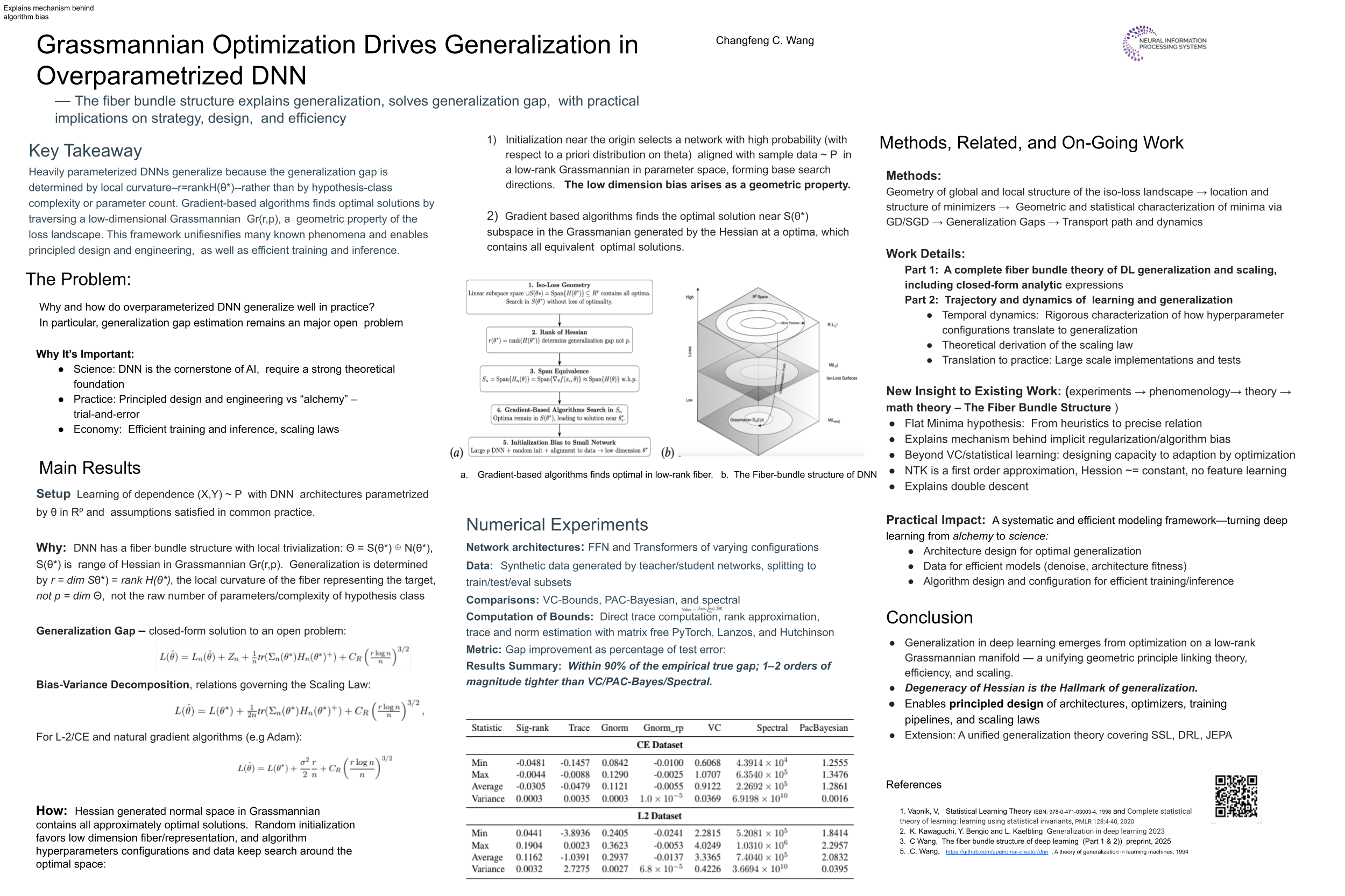 We present an overview of a rigorous geometric theory that addresses the long-standing problem of why heavily overparameterized deep neural networks generalize despite their ability to perfectly fit random labels (Part-1). The theory shows that gradient-based algorithms (GD/SGD) implicitly restrict optimization to a low-dimensional iso-loss manifold shaped by the data, converging with high probability to an \emph{optimal subspace} on the Grassmannian, defined by the Hessian, that contains all approximately optimal networks. Hessian degeneracy emerges as the hallmark of generalization: the \emph{effective dimensionality}—the rank of the Hessian at a minimizer—governs generalization, replacing the conventional reliance on parameter count, with isotropic random initialization identified as a driver of low dimensionality. Within this overview we highlight one key result: a closed-form, data-dependent expression for the generalization gap, resolving the decade-old open problem of gap estimation. This expression provides a precise relation between generalization error, data distribution, network, and architecture, eliminating the need for bounding arguments. The result is \emph{non-vacuous}—predicting test error with over 90\% accuracy in empirical studies—and improves upon VC, PAC-Bayesian, and spectral analyses by orders of magnitude. Beyond the NTK regime, the framework rigorously explains key empirical phenomena, including the role of flat minima, the implicit bias of SGD, and the origin of double-descent behavior. \footnote{This submission presents Part~1 of a broader framework. Part~2 Optimization Dynamics, not included here, develops the full dynamics of generalization, linking optimization configurations (learning rate, batch size, momentum) directly to generalization outcomes.}