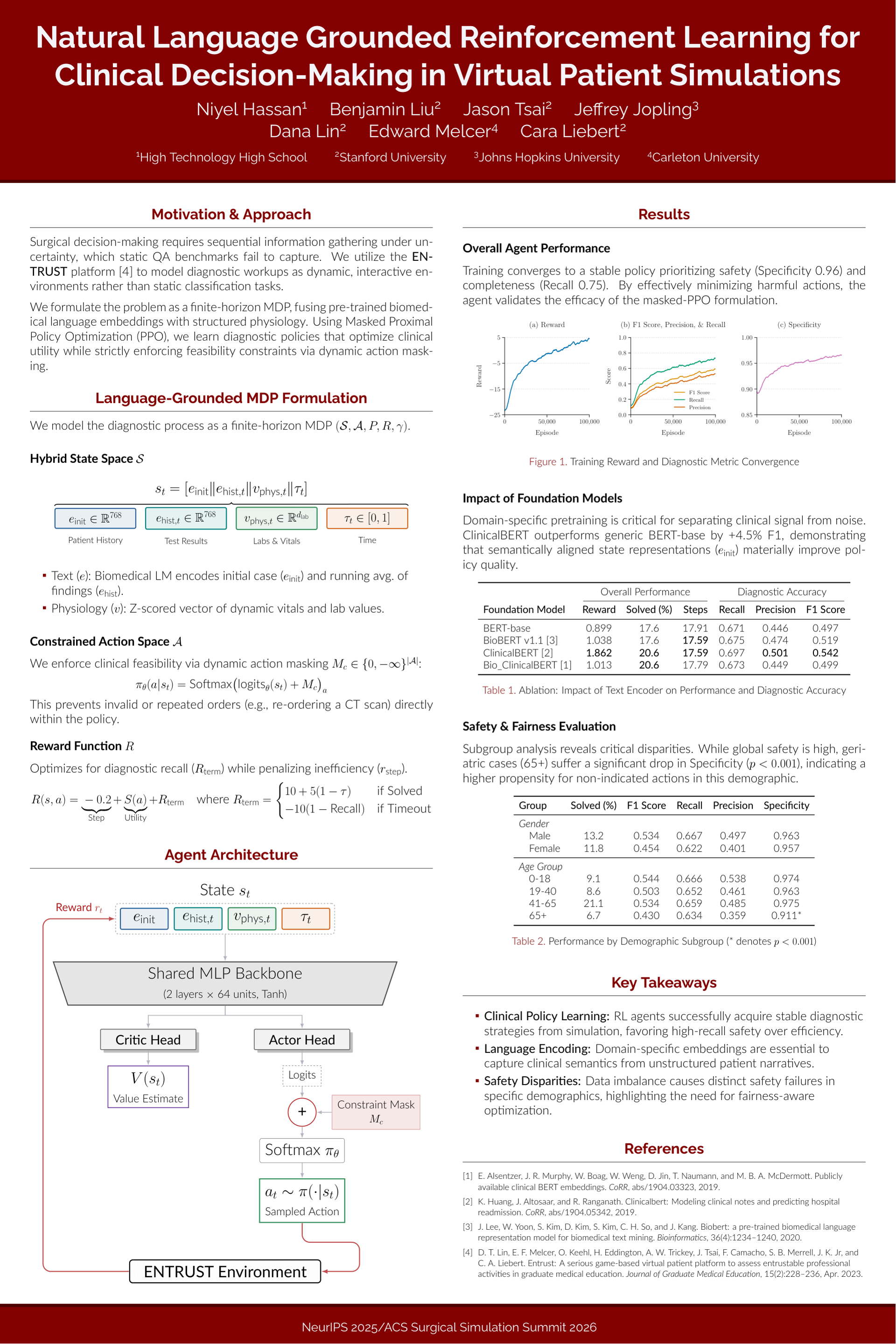 We present a reinforcement learning framework for training agents in simulated clinical diagnostic tasks within virtual patient simulations. Each patient case is cast as a Markov Decision Process with a hybrid state that fuses semantic encodings of clinical text with structured physiology and a masked Proximal Policy Optimization policy that enforces clinical action feasibility. The learned policy is stable and competent, achieving a recall of 0.75 for clinically indicated actions while avoiding over 96% of harmful actions. Domain-specific language encoders materially improve performance, underscoring the value of a language-grounded state. Crucially, we find that a conservative checklist strategy, which favors completeness over efficiency, reveals disparities across specialties and demographics, including a safety drop in geriatric cases. Our framework offers a rigorous testbed and strong baseline for language-based clinical policy learning and clarifies targets for improving efficiency, generalization, and fairness in reinforcement learning agents for clinical decision-making.