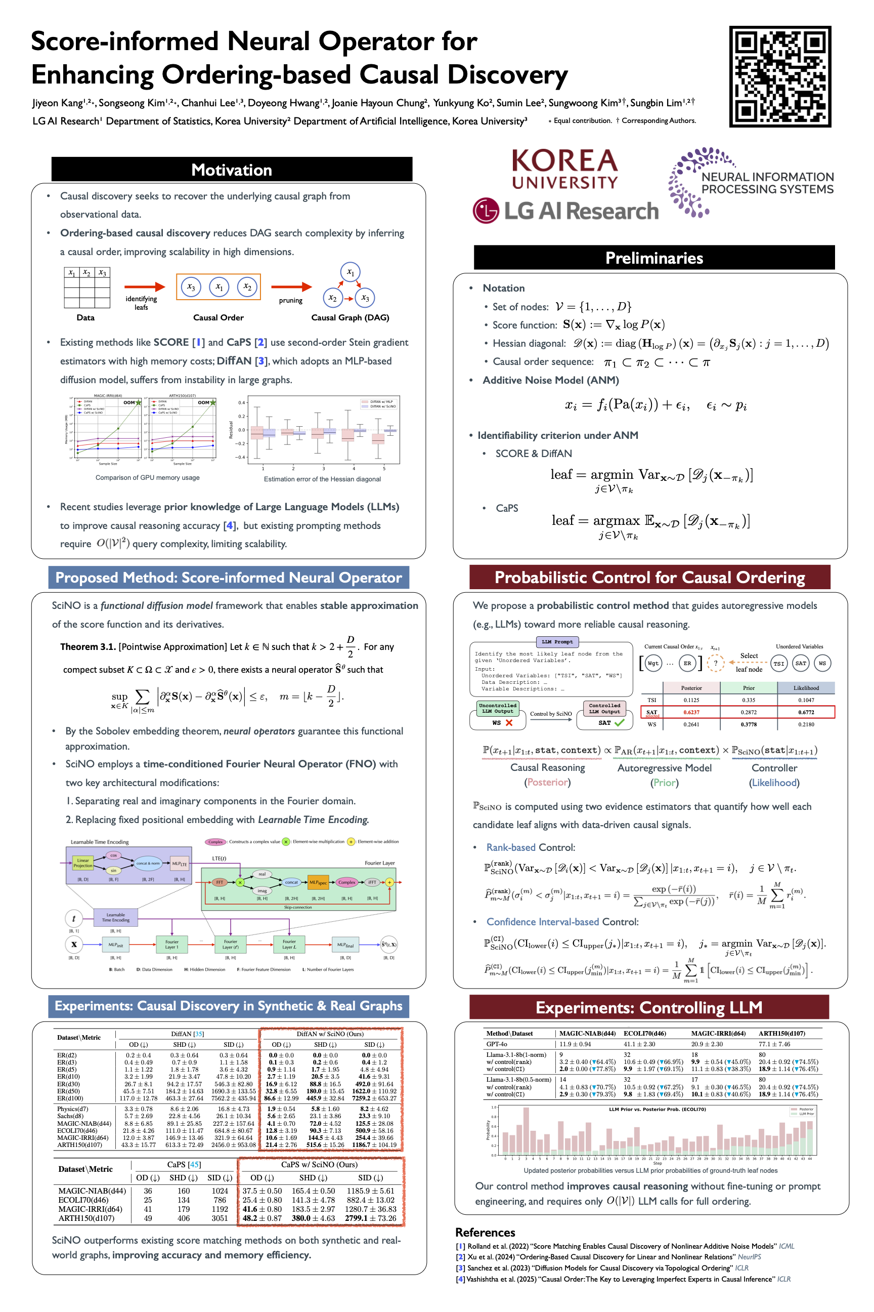 Ordering-based approaches to causal discovery identify topological orders of causal graphs, providing scalable alternatives to combinatorial search methods. Under the Additive Noise Models (ANMs) assumption, recent causal ordering methods based on score matching require an accurate estimation of the Hessian diagonal of the log-densities. However, previous approaches mainly use Stein gradient estimators, which are computationally expensive and memory-intensive. Although DiffAN addresses these limitations by substituting kernel-based estimates with diffusion models, it remains numerically unstable due to the second-order derivatives of score models. To alleviate these problems, we propose Score-informed Neural Operator (SciNO), a probabilistic generative model in smooth function spaces designed to stably approximate the Hessian diagonal and to preserve structural information during the score modeling. Empirical results show that SciNO reduces order divergence by 42.7% on synthetic graphs and by 31.5% in real-world datasets on average compared to DiffAN, while maintaining memory efficiency and scalability. Furthermore, we propose a probabilistic control algorithm for causal reasoning with autoregressive models that integrates SciNO's probability estimates with autoregressive model priors, enabling reliable data-driven causal ordering informed by semantic information. Consequently, the proposed method enhances causal reasoning abilities of LLMs without additional fine-tuning or prompt engineering.