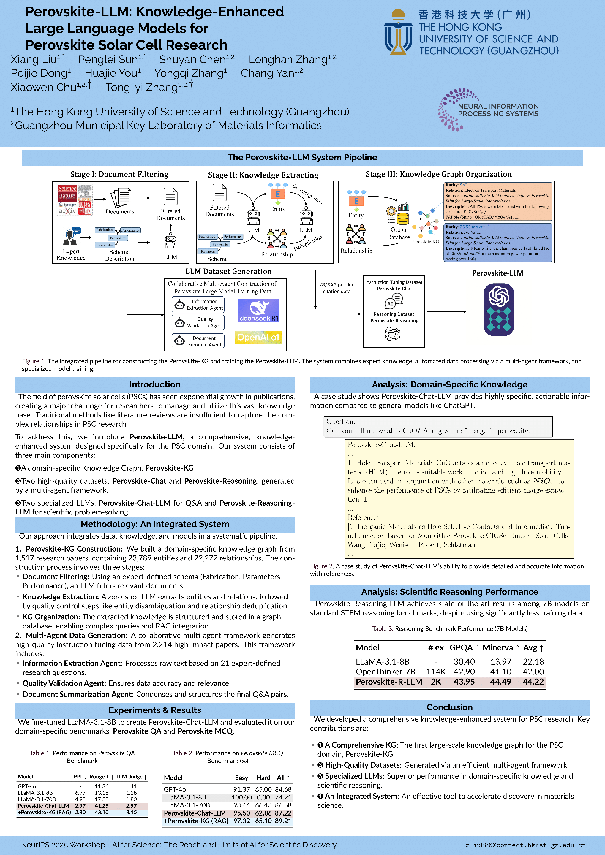 The rapid advancement of perovskite solar cells (PSCs) has led to an exponential growth in research publications, creating an urgent need for efficient knowledge management and reasoning systems in this domain. We present a comprehensive knowledge-enhanced system for PSCs that integrates three key components. First, we develop Perovskite-KG, a domain-specific knowledge graph constructed from 1,517 research papers, containing 23,789 entities and 22,272 relationships. Second, we create two complementary datasets: Perovskite-Chat, comprising 55,101 high-quality question-answer pairs generated through a novel multi-agent framework, and Perovskite-Reasoning, containing 2,217 carefully curated materials science problems. Third, we introduce two specialized large language models: Perovskite-Chat-LLM for domain-specific knowledge assistance and Perovskite-Reasoning-LLM for scientific reasoning tasks. Experimental results demonstrate that our system significantly outperforms existing models in both domain-specific knowledge retrieval and scientific reasoning tasks, providing researchers with effective tools for literature review, experimental design, and complex problem-solving in PSC research.