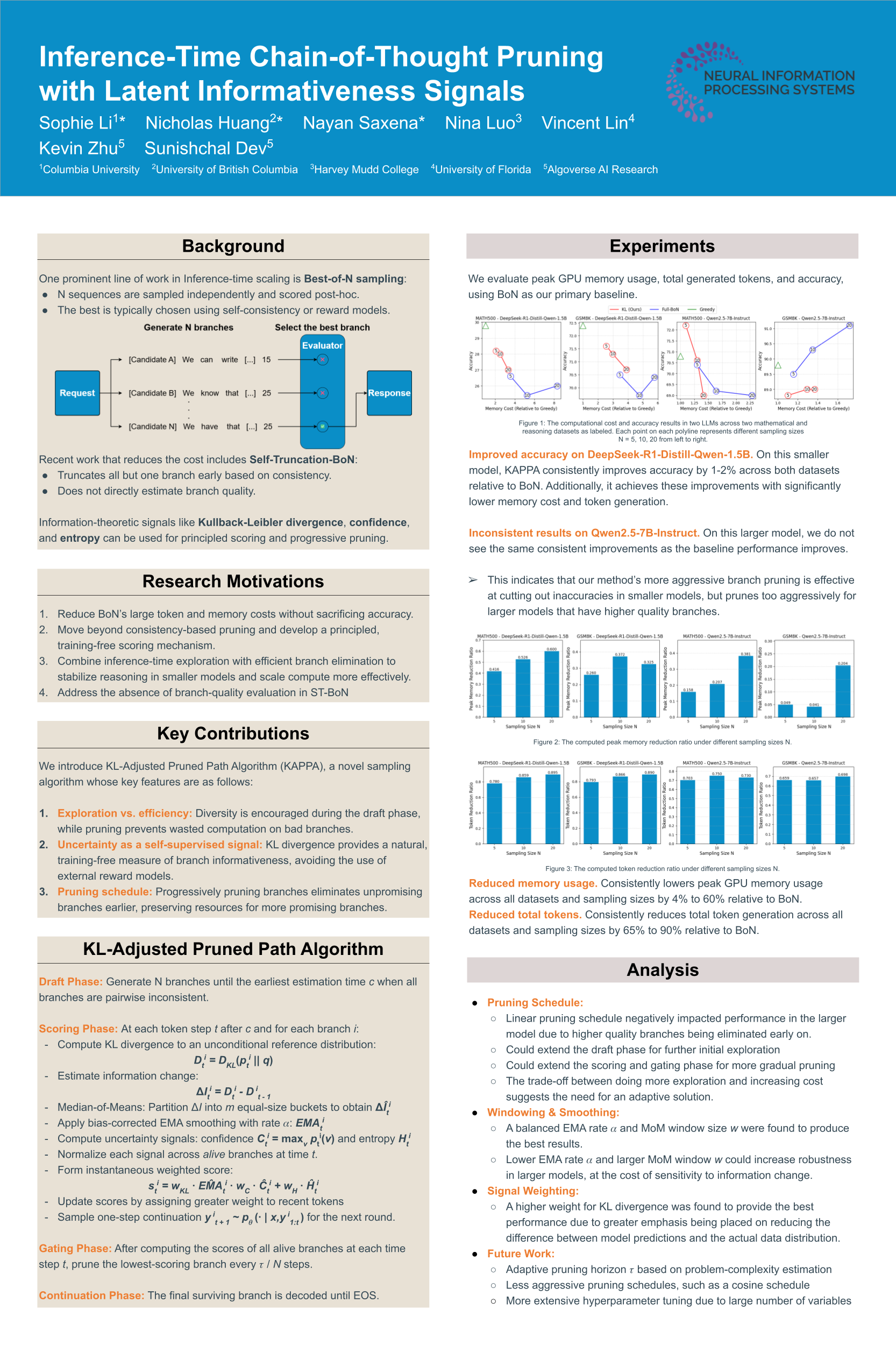 Large language models (LLMs) improve reasoning accuracy when generating multiple candidate solutions at test time, but standard methods like Best-of-N (BoN) incur high computational cost by fully generating all branches. Self-Truncation Best-of-N (ST-BoN) mitigates this by truncating unpromising paths early, but its reliance on consistency-based heuristics does not directly evaluate branch quality, which can limit efficiency on heterogeneous tasks. We present KL-Adjusted Pruned Path Algorithm (KAPPA), an inference-time method that combines Kullback–Leibler divergence, confidence, and entropy into a principled scoring function to guide progressive pruning. By promoting diversity during exploration and selectively eliminating low-scoring branches, KAPPA maintains accuracy while substantially reducing memory and token usage. Experiments on GSM8K and MATH500 with DeepSeek-R1-Distill-Qwen-1.5B and Qwen2.5-7B-Instruct demonstrate that KAPPA stabilizes performance in smaller models and achieves up to ~60\% reduction in peak memory and ~90\% reduction in total token generation relative to BoN, with minimal impact on accuracy.