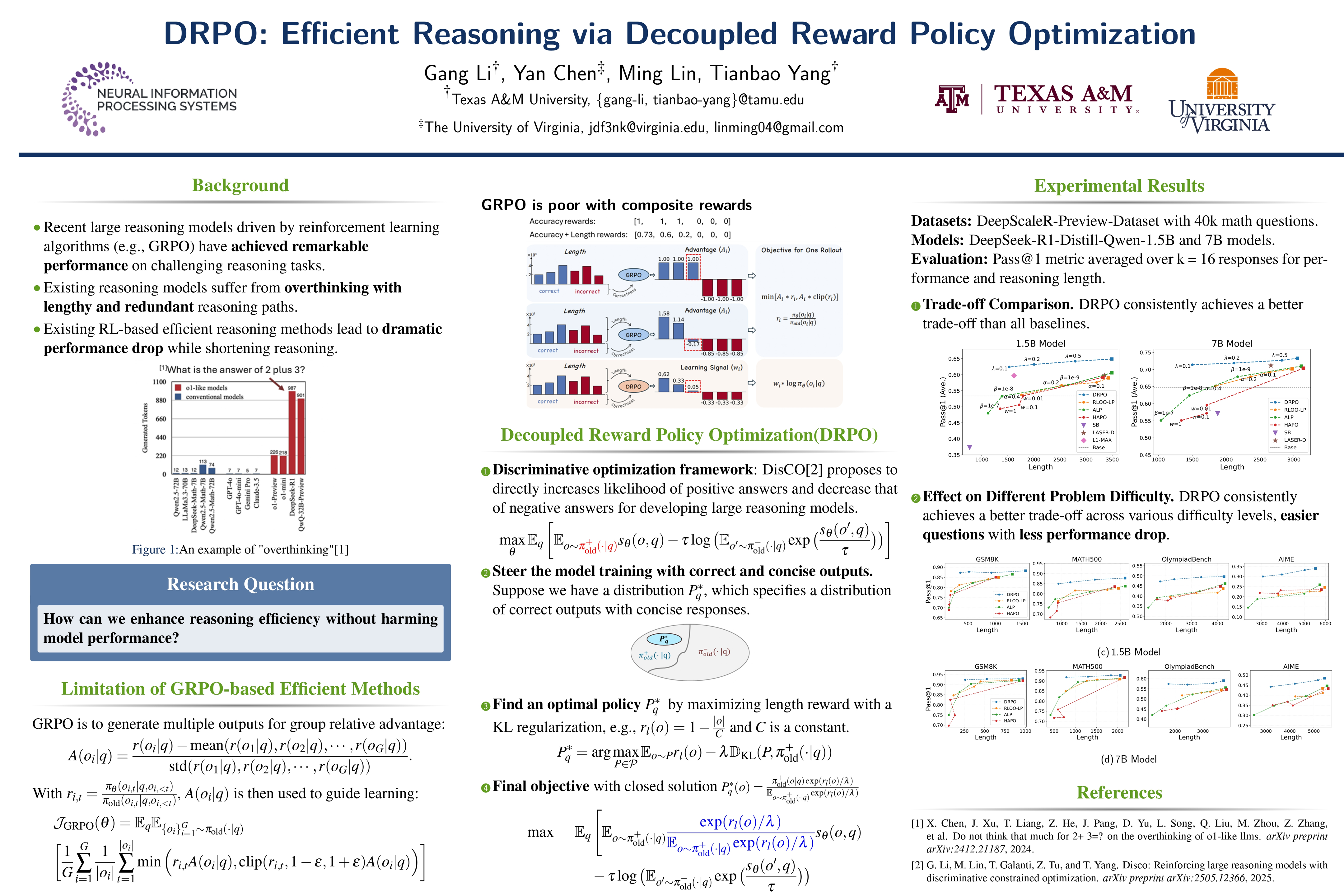 Recent large reasoning models (LRMs) driven by reinforcement learning algorithms (e.g., GRPO) have achieved remarkable performance on challenging reasoning tasks. However, these models suffer from overthinking, generating unnecessarily long and redundant reasoning even for simple questions, which substantially increases computational cost and response latency. While existing methods incorporate length rewards to GRPO to promote concise reasoning, they incur significant performance degradation. We identify the root cause: when rewards for correct but long rollouts are penalized, GRPO's group-relative advantage function can assign them negative advantages, actively discouraging valid reasoning. To overcome this, we propose Decoupled Reward Policy Optimization (DRPO), a novel framework that decouples the length-based learning signal of correct rollouts from incorrect ones. DRPO ensures that reward signals for correct rollouts are normalized solely within the positive group, shielding them from interference by negative samples. The DRPO's objective is grounded in integrating an optimized positive data distribution, which maximizes length-based rewards under a KL regularization, into a discriminative objective. We derive a closed-form solution for this distribution, enabling efficient computation of the objective and its gradients using only on-policy data and importance weighting. Of independent interest, this formulation is general and can incorporate other preference rewards of positive data beyond length. Experiments on mathematical reasoning tasks demonstrate DRPO's significant superiority over six efficient reasoning baselines. Notably, with a 1.5B model, our method achieves 77\% length reduction with only 1.1\% performance loss on simple questions like GSM8k dataset, while the follow-up baseline sacrifices 4.3\% for 68\% length reduction.