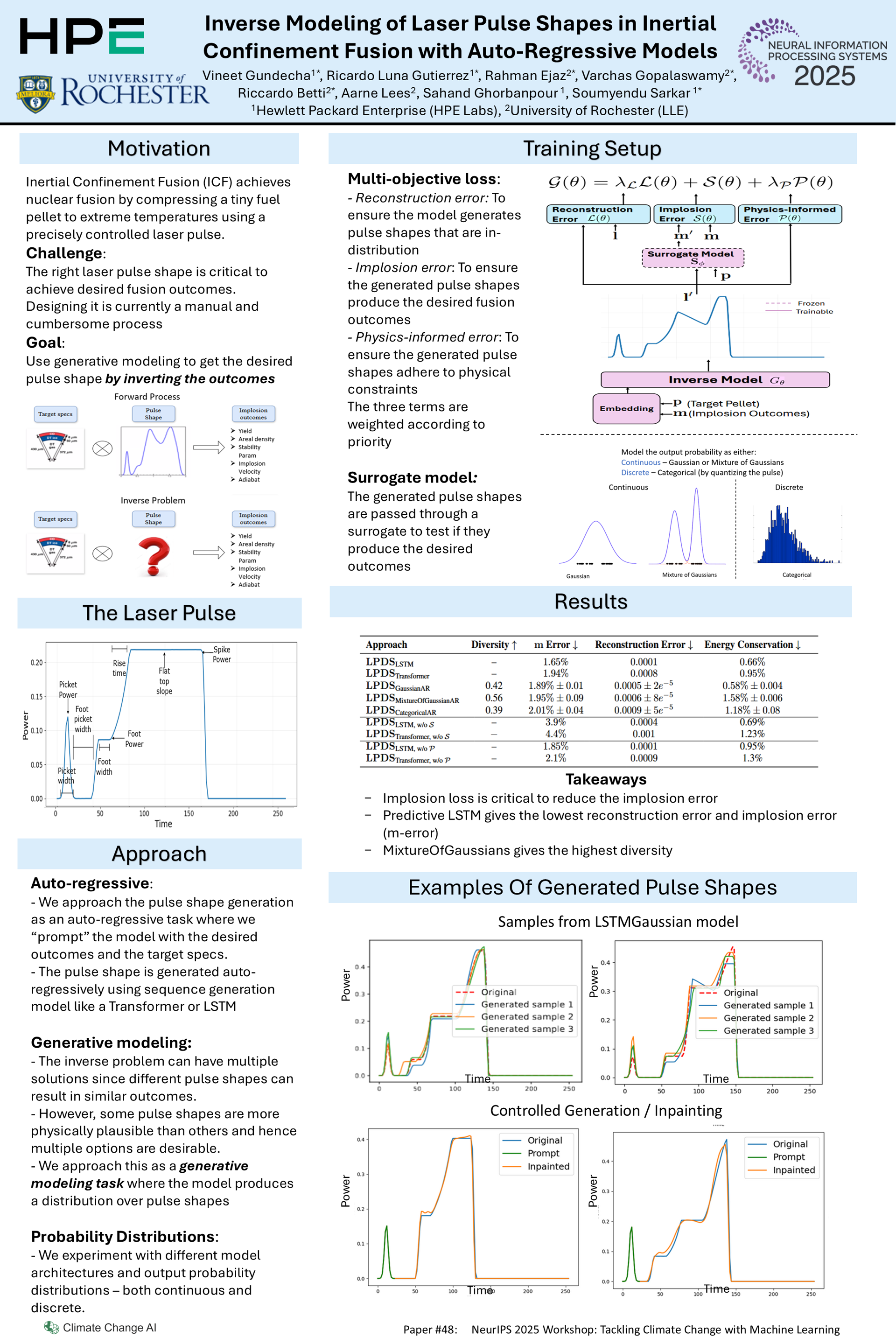 Realizing practical fusion energy remains one of society’s most significant unresolved scientific challenges, carrying profound implications for sustainable, carbon-free power. A key determinant of success in Inertial Confinement Fusion (ICF) experiments is the design of a Laser Pulse (LP) Shape capable of optimally driving implosions within strict physical limits. Conventional LP design depends on costly simulations and labor-intensive iterative tuning. To address this, we introduce the Laser Pulse Shape Design System (LPDS), a generative inverse modeling framework based on auto-regression that directly maps desired fusion outcomes and target pellet parameters to optimized LPs. We explore a multi-objective training setup to design diverse LPs that adhere to physical constraint while achieving less than 2\% error in the desired implosion outcomes. In addition, we incorporate constraint-conditioning via inpainting and gradient-based editing strategies, enabling precise control over pulse characteristics during generation. This framework offers a data-driven solution for LP design in ICF, advancing the pursuit of practical, sustainable fusion energy.