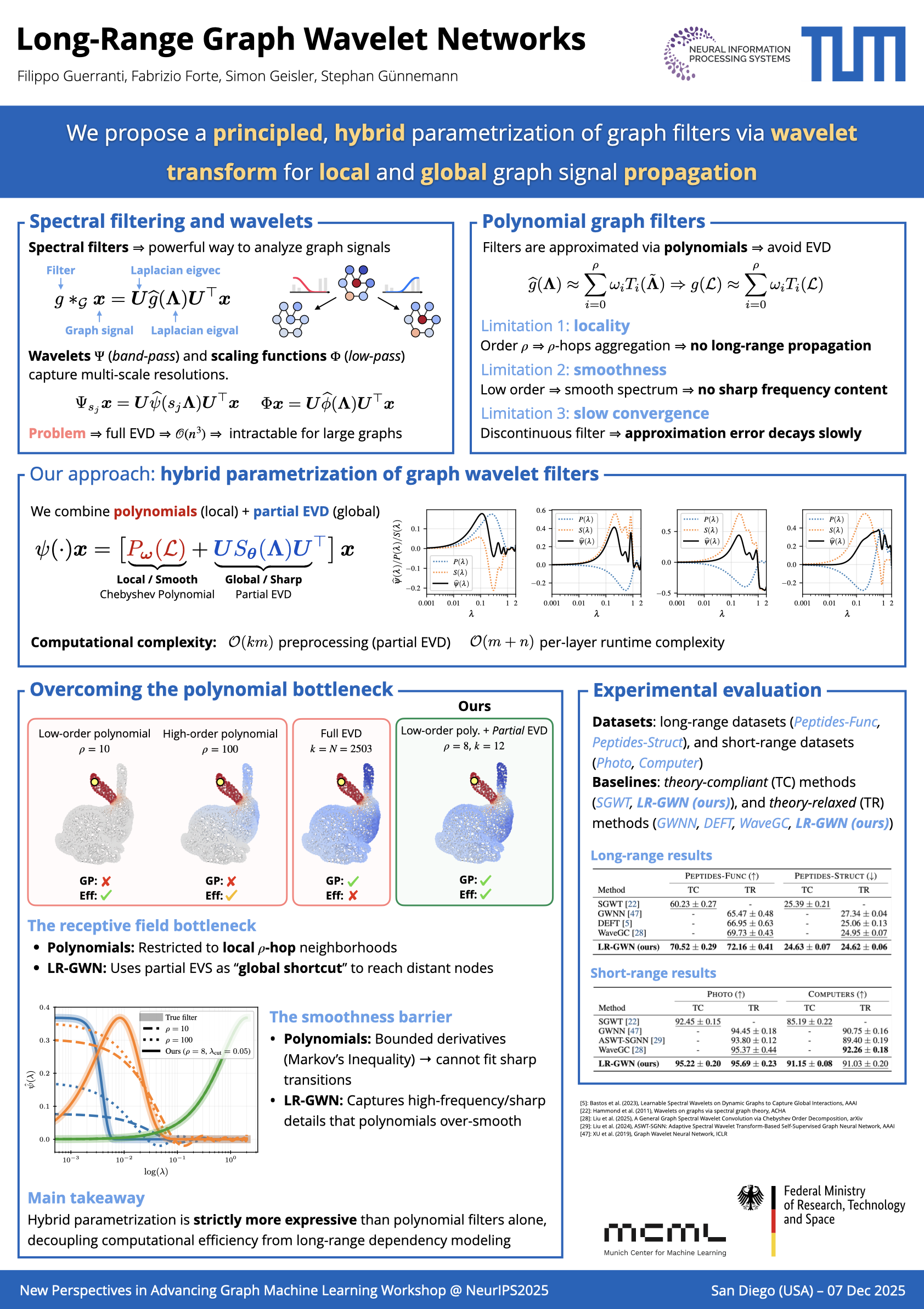 Modeling long-range interactions, the propagation of information across distant parts of a graph, is a central challenge in graph machine learning. Graph wavelets, inspired by multi-resolution signal processing, provide a principled way to capture both local and global structures. However, existing wavelet-based graph neural networks rely on finite-order polynomial approximations, which limit their receptive fields and hinder long-range propagation. We propose Long-Range Graph Wavelet Networks (LR-GWN), which decompose wavelet filters into complementary local and global components. Local aggregation is handled with efficient low-order polynomials, while long-range interactions are captured through a flexible spectral-domain parameterization. This hybrid design unifies short- and long-distance information flow within a principled wavelet framework. Experiments show that LR-GWN achieves state-of-the-art performance among wavelet-based methods on long-range benchmarks, while remaining competitive on short-range datasets.