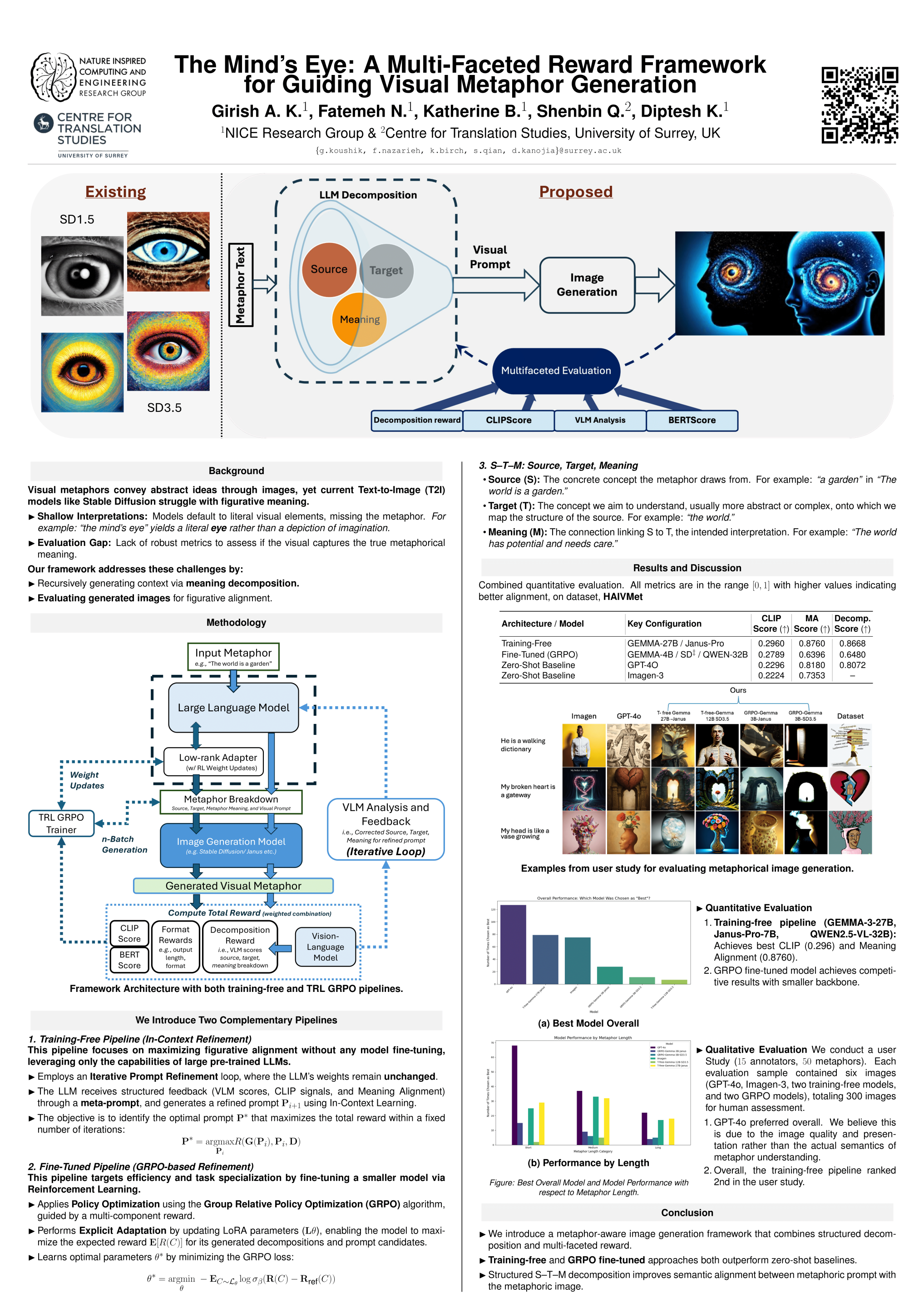 Visual metaphor generation is a challenging task that aims to generate an image given an input text metaphor. Inherently, such a task needs language understanding to bind a source concept to a target concept, in a way that preserves meaning while ensuring visual coherence. Current systems often literalize input text and lack reliable signals for figurative alignment. We present a self-evaluating framework that guides generation using multiple rewards, combining standard metrics with two new ones: a Metaphor Decomposition Score and a Meaning Alignment metric. Within this reward-based framework, we propose two pipelines: 1) a training-free pipeline that decomposes input text into source, target, and intended meaning (S-T-M) for synthesis, and 2) a pipeline that uses lightweight reinforcement learning (RL) to optimize proposed self-evaluation rewards without large-scale retraining. Upon evaluation, the training-free pipeline outperforms strong closed baselines (GPT-4o and Imagen), on decomposition, CLIP, and meaning alignment scores, with the RL-based pipeline close behind. A user study shows participants still prefer GPT-4o overall, yet our training-free pipeline leads open-source methods and edges Imagen on abstract metaphors. Analyses indicate S-T-M prompting benefits longer or more abstract metaphors, and that results are sensitive to sampler settings. This framework is useful for generating controllable visual metaphors with modest computational requirements, and the reward design offers a practical path to aligning creative image synthesis with intended meaning. The code is available at https://github.com/gak97/visual-metaphor.