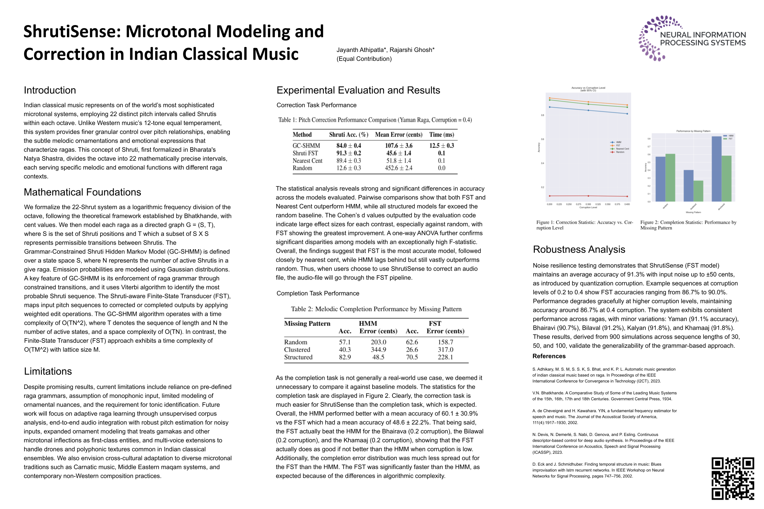 Indian classical music relies on a sophisticated microtonal system of 22 Shrutis (pitch intervals), which provides expressive nuance beyond the 12-tone equal temperament system. Existing symbolic music processing tools fail to account for these microtonal distinctions and culturally specific raga grammars that govern melodic movement. We present ShrutiSense, a comprehensive symbolic pitch processing system designed for Indian classical music, addressing two critical tasks: (1) correcting westernized or corrupted pitch sequences, and (2) completing melodic sequences with missing values. Our approach employs complementary models for different tasks: a Shruti-aware Finite-State Transducer (FST) that performs contextual corrections within the 22-Shruti framework and a Grammar-Constrained Shruti Hidden Markov Model (GC-SHMM) that incorporates raga-specific transition rules for contextual completions. Comprehensive evaluation on simulated data across five ragas demonstrates that ShrutiSense (FST model) achieves 91.3% Shruti classification accuracy for correction tasks, with example sequences showing 86.7–90.0% accuracy at corruption levels of 0.2 to 0.4. The system exhibits robust performance under pitch noise up to ±50 cents, maintaining consistent accuracy across ragas (90.7–91.8%), thus preserving the cultural authenticity of Indian classical music expression.