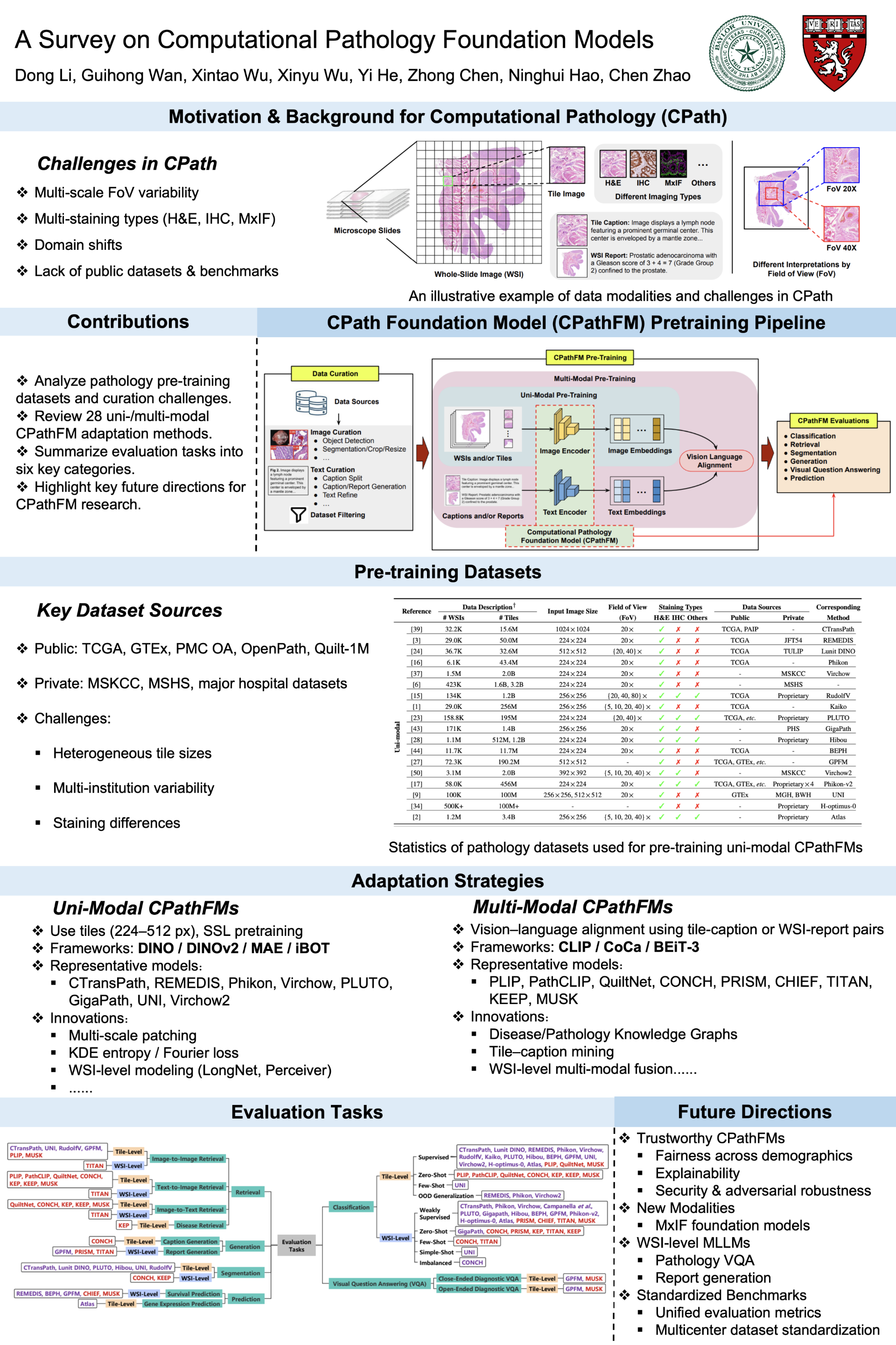 Computational pathology foundation models (CPathFMs) have emerged as a powerful approach for analyzing histopathological data, leveraging self-supervised learning to extract robust feature representations from unlabeled whole-slide images. These models, categorized into uni-modal and multi-modal frameworks, have demonstrated promise in automating complex pathology tasks such as segmentation, classification, and biomarker discovery. However, the development of CPathFMs presents significant challenges, such as limited data accessibility, high variability across datasets, the necessity for domain-specific adaptation, and the lack of standardized evaluation benchmarks. This survey provides a comprehensive review of CPathFMs in computational pathology, focusing on datasets, adaptation strategies, and evaluation tasks. We analyze key techniques, such as contrastive learning, masked image modeling and multi-modal integration, and highlight existing gaps in current research. Finally, we explore future directions from four perspectives for advancing CPathFMs. This survey serves as a valuable resource for researchers, clinicians, and AI practitioners, guiding the advancement of CPathFMs toward robust and clinically applicable AI-driven pathology solutions.