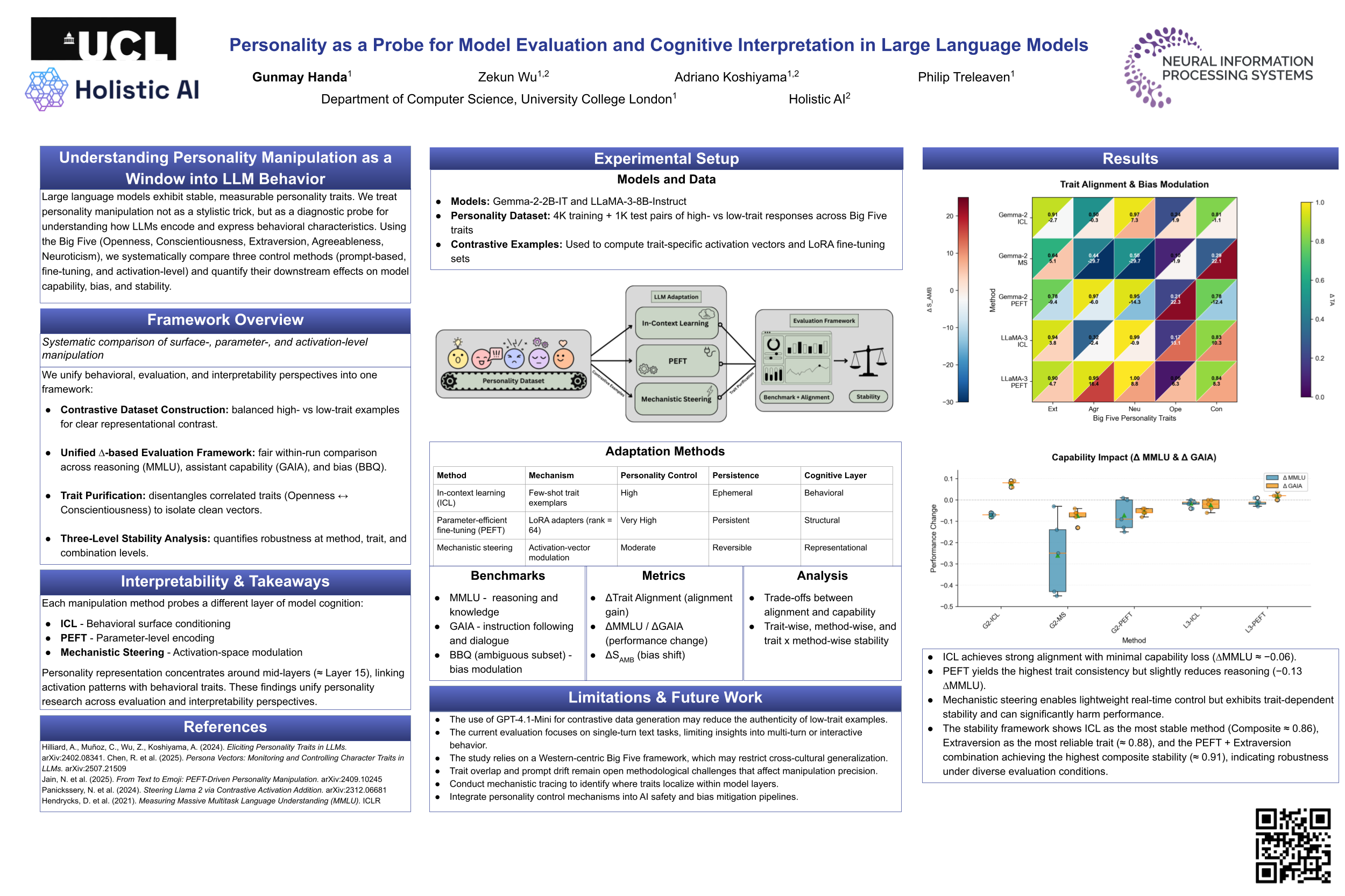 Personality manipulation in large language models (LLMs) is increasingly applied in customer service and agentic scenarios, yet its mechanisms and trade-offs remain unclear. We present a systematic study of personality control using the Big Five traits, comparing in-context learning (ICL), parameter-efficient fine-tuning (PEFT), and mechanistic steering (MS). Our contributions are fourfold. First, we construct a contrastive dataset with balanced high/low trait responses, enabling effective steering vector computation and fair cross-method evaluation. Second, we introduce a unified evaluation framework based on within-run $\Delta$ analysis that disentangles, reasoning capability, agent performance, and demographic bias across MMLU, GAIA, and BBQ benchmarks. Third, we develop trait purification techniques to separate openness from conscientiousness, addressing representational overlap in trait encoding. Fourth, we propose a three-level stability framework that quantifies method-, trait-, and combination-level robustness, offering practical guidance under deployment constraints. Experiments on Gemma-2-2B-IT and LLaMA-3-8B-Instruct reveal clear trade-offs: ICL achieves strong alignment with minimal capability loss, PEFT delivers the highest alignment at the cost of degraded task performance, and MS provides lightweight runtime control with competitive effectiveness. Trait-level analysis shows openness as uniquely challenging, agreeableness as most resistant to ICL, and personality encoding consolidating around intermediate layers. Taken together, these results establish personality manipulation as a multi-level probe into behavioral representation, linking surface conditioning, parameter encoding, and activation-level steering, and positioning mechanistic steering as a lightweight alternative to fine-tuning for both deployment and interpretability.