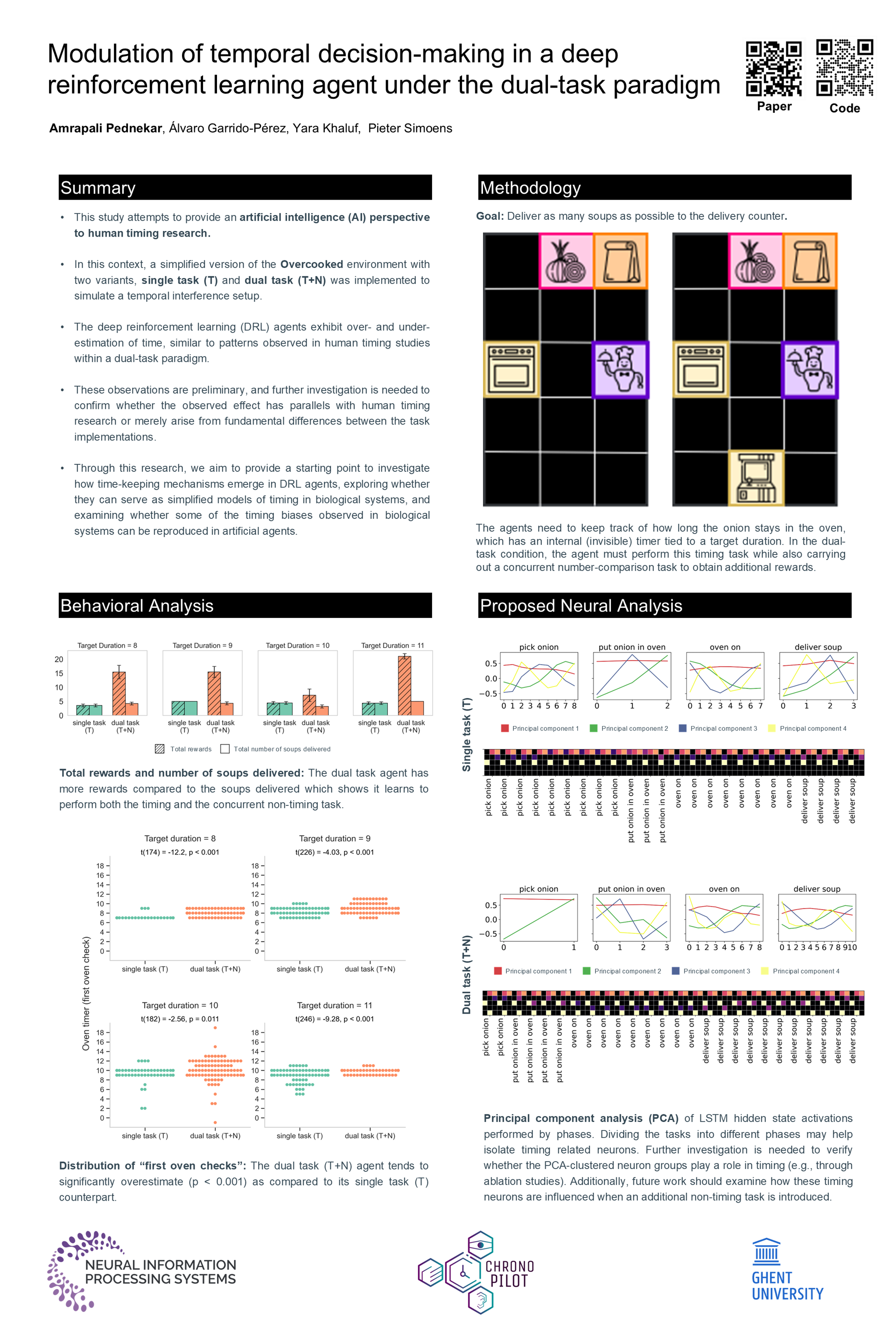 This study explores the interference in temporal processing within a dual-task paradigm from an artificial intelligence (AI) perspective. In this context, the dual-task setup is implemented as a simplified version of the Overcooked environment with two variations, single task (T) and dual task (T+N). Both variations involve an embedded time production task, but the dual task (T+N) additionally involves a concurrent number comparison task. Two deep reinforcement learning (DRL) agents were separately trained for each of these tasks. These agents exhibited emergent behavior consistent with human timing research. Specifically, the dual task (T+N) agent exhibited significant overproduction of time relative to its single task (T) counterpart. This result was consistent across four target durations. Preliminary analysis of neural dynamics in the agents' LSTM layers did not reveal any clear evidence of a dedicated or intrinsic timer. Hence, further investigation is needed to better understand the underlying time-keeping mechanisms of the agents and to provide insights into the observed behavioral patterns. This study is a small step towards exploring parallels between emergent DRL behavior and behavior observed in biological systems in order to facilitate a better understanding of both.