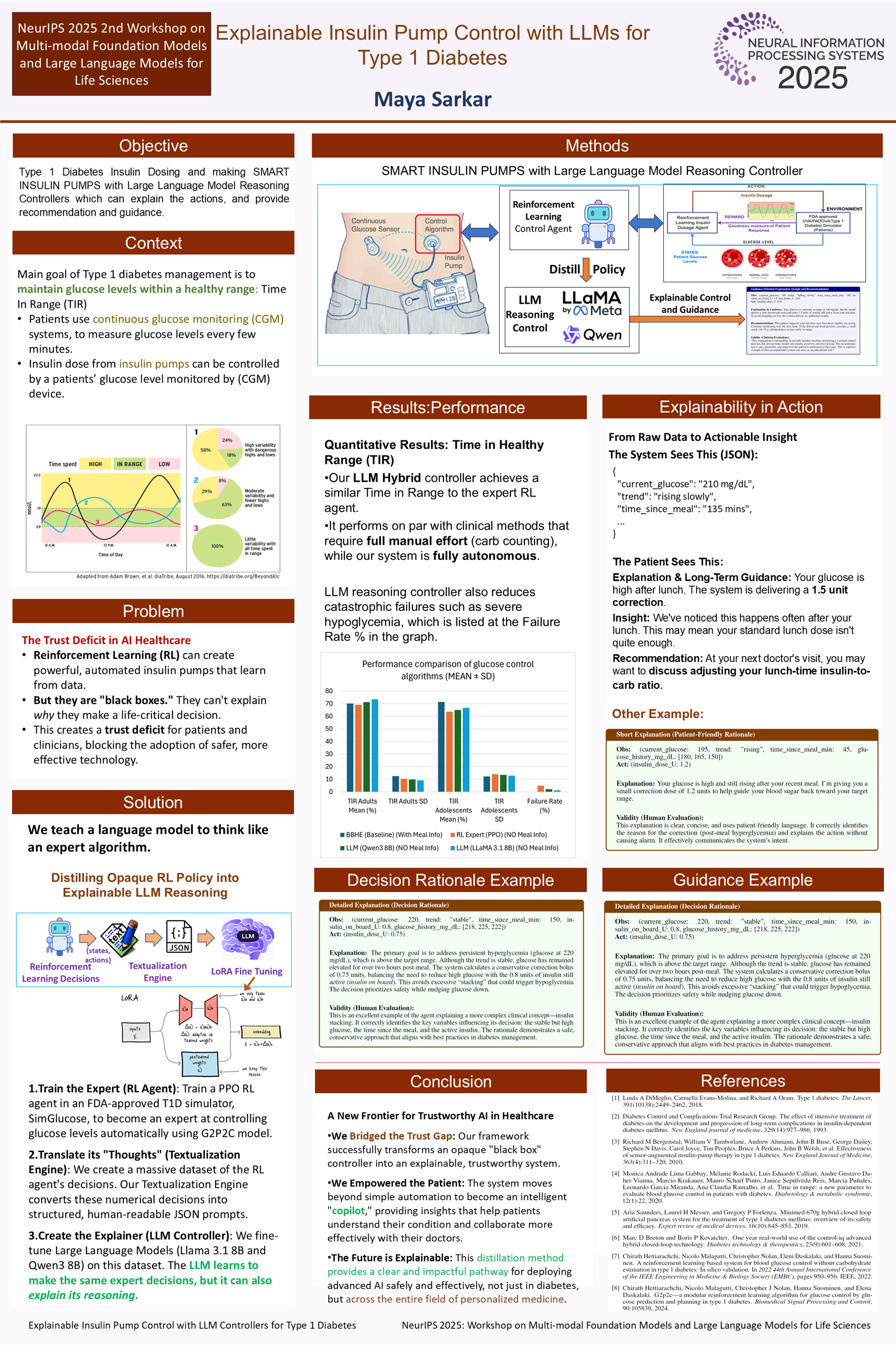 Living with Type 1 Diabetes (T1D) is a constant balancing act, requiring patients to make complex decisions based on endless streams of data. While Artificial Pancreas Systems (APS) powered by Reinforcement Learning (RL) have shown promise in automating insulin delivery, their "black-box" nature makes it hard for patients and doctors to trust them fully. This paper presents LLM-T1D, a groundbreaking approach that combines the precision of RL with the clear, human-like reasoning of Large Language Models (LLMs) to create a more transparent and reliable insulin pump controller. By training an expert RL system and then distilling its knowledge into fine-tuned Llama 3.1 8B and Qwen3 8B models using a LoRA architecture, we developed a controller that not only matches or surpasses the RL system’s performance but also explains its decisions in plain, understandable language. Tested on the FDA-approved UVA/Padova T1D simulator, the LLM controllers deliver excellent blood sugar control while giving patients clear, data-driven insights they can trust. This hybrid system transforms a complex algorithm into an approachable "copilot," paving the way for safer, more understandable, and patient-centered AI solutions for managing chronic conditions like T1D.