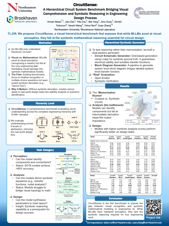 Engineering design operates through hierarchical abstraction from system specifications to component implementations, requiring visual understanding coupled with mathematical reasoning at each level. While Multi-modal Large Language Models (MLLMs) excel at natural image tasks, their ability to extract mathematical models from technical diagrams remains unexplored. We present \textbf{CircuitSense}, a comprehensive benchmark evaluating circuit understanding across this hierarchy through 8,006+ problems. Our benchmark uniquely examines the complete engineering workflow: Perception, Analysis, and Design, with a particular emphasis on the critical but underexplored capability of deriving symbolic equations from visual inputs. We introduce a hierarchical synthetic generation pipeline with auto-derived symbolic equation labels. Comprehensive evaluation of six state-of-the-art MLLMs, reveals fundamental limitations in visual-to-mathematical reasoning. Closed-source models achieve over 85\% accuracy on perception tasks involving component recognition and topology identification, yet their performance on symbolic derivation and analytical reasoning falls below 19\%, exposing a critical gap between visual parsing and symbolic reasoning. Models with stronger symbolic reasoning capabilities consistently achieve higher design task accuracy, confirming the fundamental role of mathematical understanding in circuit synthesis and establishing symbolic reasoning as the key metric for engineering competence. \textbf{Project page:} \href{https://circuitsense-benchmark.github.io}{https://circuitsense-benchmark.github.io}