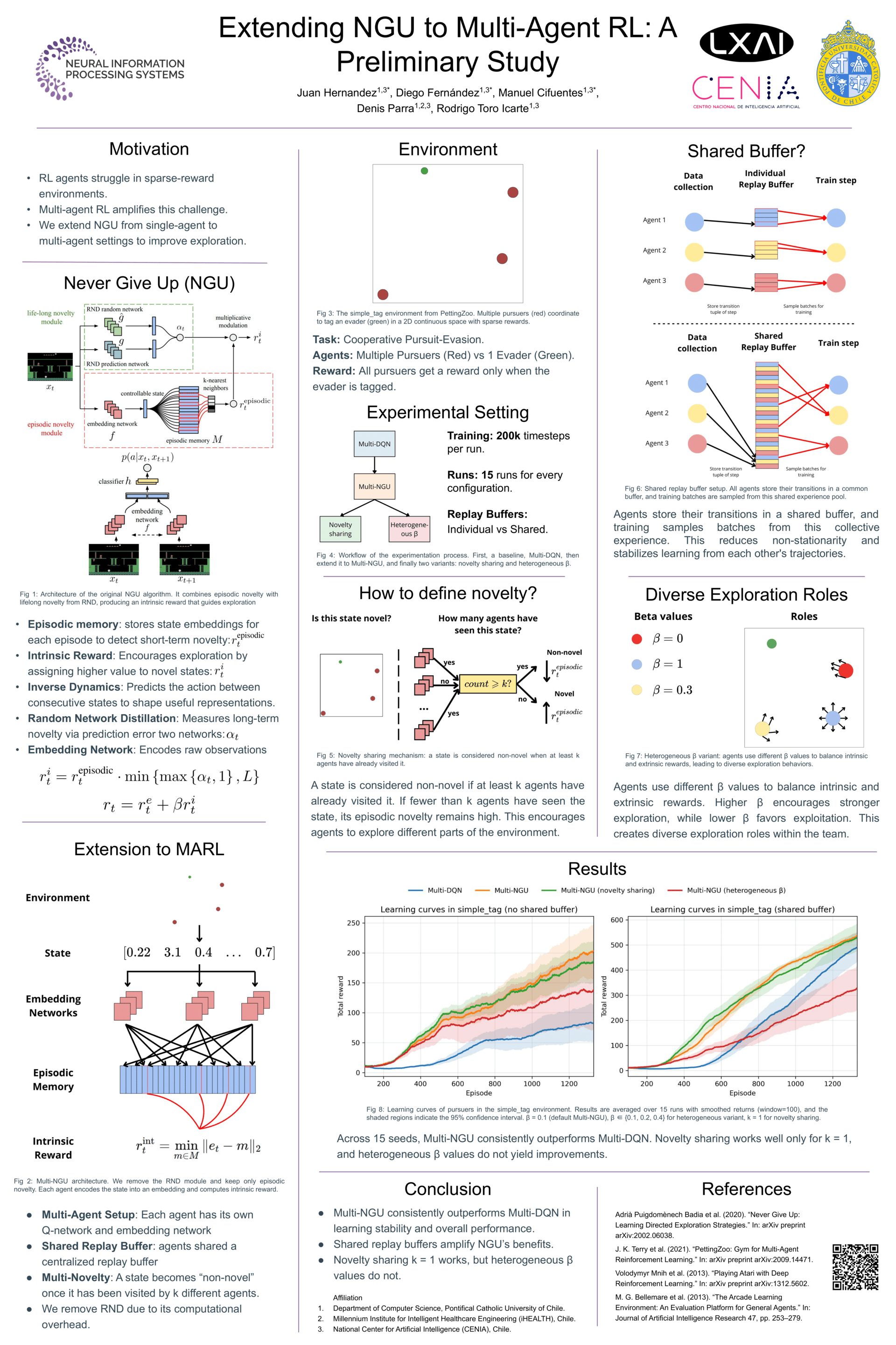 The Never Give Up (NGU) algorithm has proven effective in reinforcement learning tasks with sparse rewards by combining episodic novelty and intrinsic motivation. In this work, we extend NGU to multi-agent environments and evaluate its performance in the simple\_tag environment from the PettingZoo suite. Compared to a multi-agent DQN baseline, NGU achieves moderately higher returns and more stable learning dynamics. Building on this, we investigate three design choices: (1) shared replay buffer versus individual replay buffers, (2) sharing episodic novelty among agents using different $k$ thresholds, and (3) using heterogeneous values of the $\beta$ parameter. Our results show that NGU with a shared replay buffer yields the best performance and stability, highlighting that the gains come from combining NGU’s intrinsic exploration with experience sharing. Sharing novelty produces comparable performance when $k=1$, but degrades learning for larger $k$ values. Finally, heterogeneous $\beta$ values do not improve over a small common value. These findings suggest that NGU can be effectively applied in multi-agent settings when experiences are shared and intrinsic exploration signals are carefully tuned.