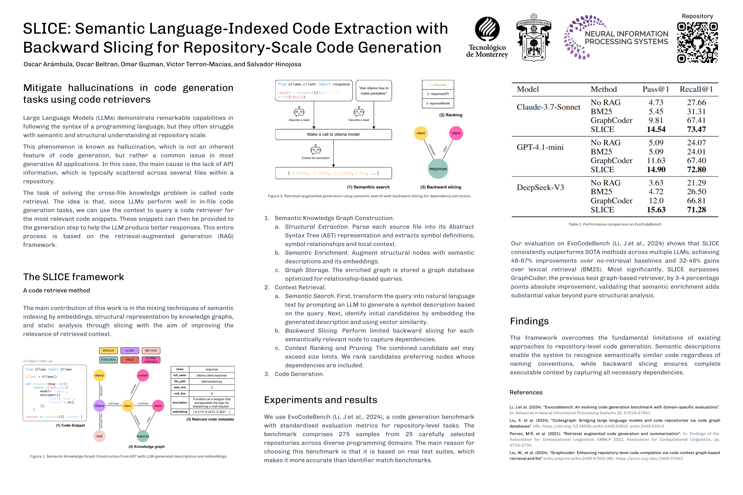 Large language models (LLMs) frequently generate syntactically correct but functionally flawed code when operating at repository scale, with failure rates increasing on cross-file dependencies. Existing retrieval-augmented approaches rely on textual similarity or structural patterns that fail to capture semantic intent. We present SLICE (Semantic Language-Indexed Code Extraction), a novel framework that reduces hallucinations by combining semantic understanding with structural dependency analysis. SLICE constructs knowledge graphs from abstract syntax trees where each node is enriched with natural language descriptions generated via few-shot learning, enabling semantic search that understands code functionality rather than syntax. Crucially, SLICE integrates backward program slicing to automatically retrieve not just relevant code, but also its dependencies, ensuring complete executable context. SLICE was Evaluated on EvoCodeBench across three state-of-the-art models (Claude-3.7-Sonnet, GPT-4.1-mini, DeepSeek-V3), achieving Pass@1 scores of 14.54\%, 14.90\%, and 15.63\% respectively—representing 48-67\% improvements over no-retrieval baselines and 32-48\% over BM25. Compared to GraphCoder, the state-of-the-art graph-based retriever, SLICE delivers consistent 3-4 percentage point absolute gains. These improvements demonstrate that combining semantic descriptions with dependency-aware retrieval is essential for reliable repository-level code generation.