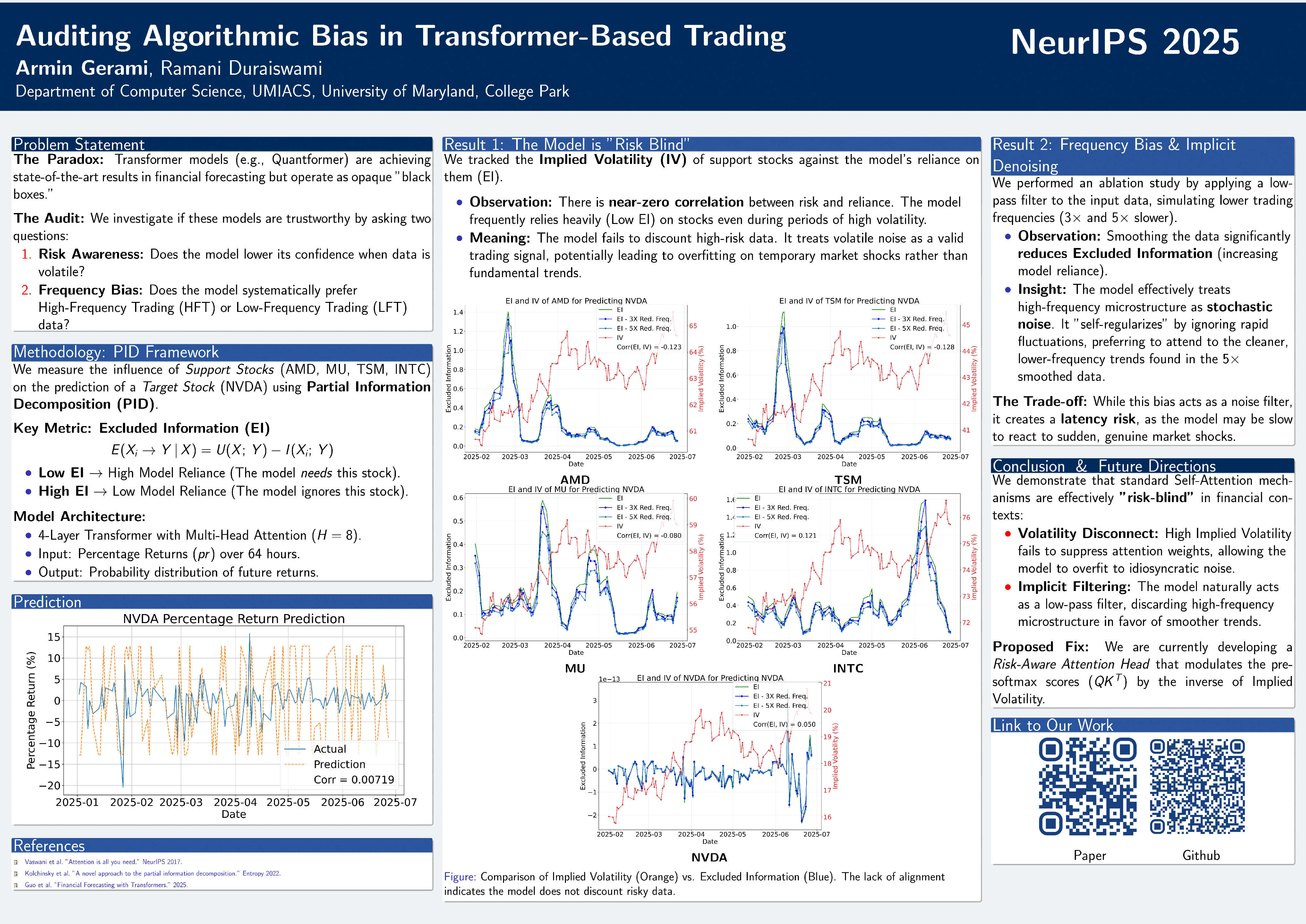 Transformer models have become increasingly popular in financial applications, yet their potential risk making and biases remain under-explored. The purpose of this work is to audit the reliance of the model on volatile data for decision-making, and quantify how the frequency of price movements affects the model's prediction confidence. We employ a transformer model for prediction, and introduce a metric based on Partial Information Decomposition (PID) to measure the influence of each asset on the model's decision making. Our analysis reveals two key observations: first, the model disregards data volatility entirely, and second, it is biased toward data with lower-frequency price movements.