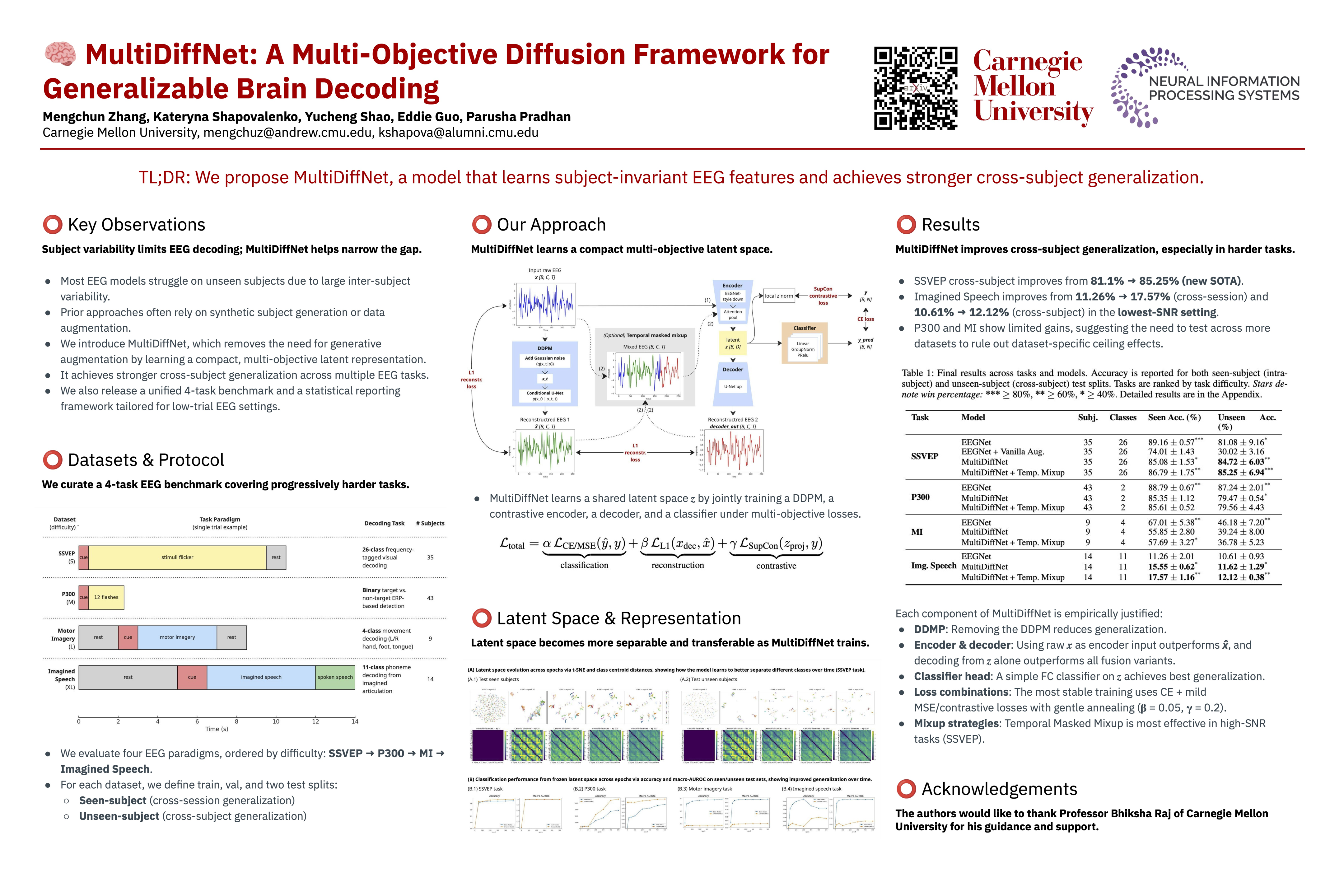 Neural decoding from electroencephalography (EEG) remains fundamentally limited by poor generalization to unseen subjects, driven by high inter-subject variability and the lack of large-scale datasets to model it effectively. Existing methods often rely on synthetic subject generation or simplistic data augmentation, but these strategies fail to scale or generalize reliably. We introduce MultiDiffNet, a diffusion-based framework that bypasses generative augmentation entirely by learning a compact latent space optimized for multiple objectives. We decode directly from this space and achieve state-of-the-art generalization across various neural decoding tasks using subject and session disjoint evaluation. We also curate and release a unified benchmark suite spanning four EEG decoding tasks of increasing complexity (SSVEP, Motor Imagery, P300, and Imagined Speech) and an evaluation protocol that addresses inconsistent split practices in prior EEG research. Finally, we develop a statistical reporting framework tailored for low-trial EEG settings. Our work provides a reproducible and open-source foundation for subject-agnostic EEG decoding in real-world BCI systems.