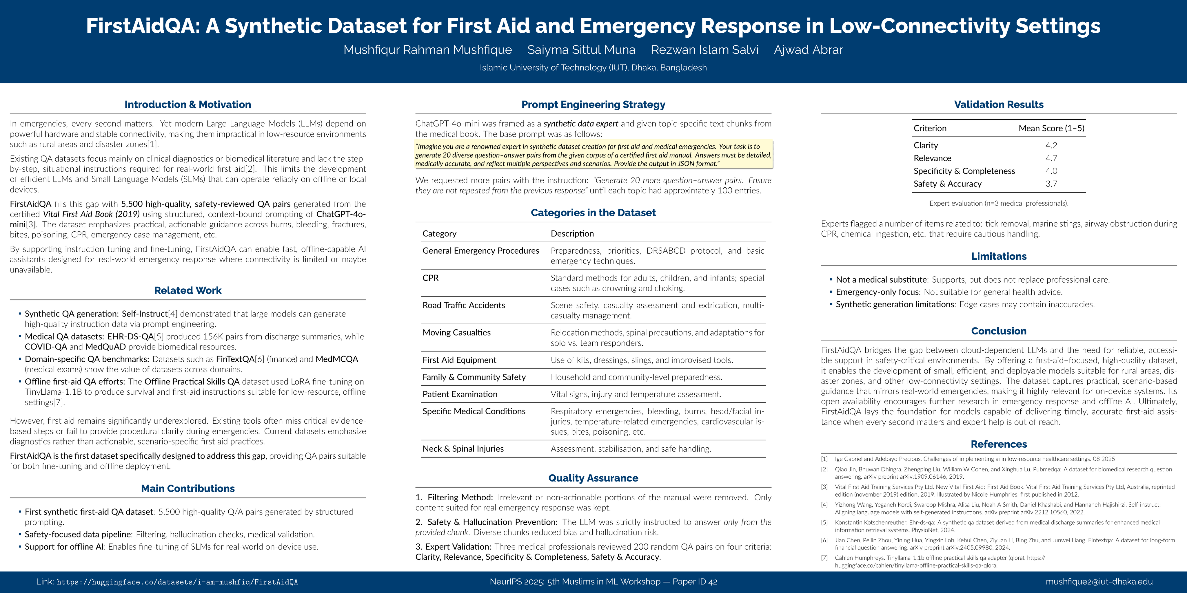 In emergency situations, every second counts. The deployment of Large Language Models (LLMs) in time-sensitive, low or zero-connectivity environments remains limited. Current models are computationally intensive and unsuitable for low-tier devices often used by first responders or civilians. A major barrier to developing lightweight, domain-specific solutions is the lack of high-quality datasets tailored to first aid and emergency response. To address this gap, we introduce \textbf{FirstAidQA}, a synthetic dataset containing 5,500 high-quality question–answer pairs that encompass a wide range of first aid and emergency response scenarios. The dataset was generated using a Large Language Model, ChatGPT-4o-mini, with prompt-based in-context learning, using texts from the Vital First Aid Book (2019). We applied preprocessing steps such as text cleaning, contextual chunking, and filtering, followed by human validation to ensure accuracy, safety, and practical relevance of the QA pairs. FirstAidQA is designed to support instruction-tuning and fine-tuning of LLMs and Small Language Models (SLMs), enabling faster, more reliable, and offline-capable systems for emergency settings. We publicly release the dataset to advance research on safety-critical and resource-constrained AI applications in first aid and emergency response. The dataset is available on Hugging Face at \url{https://huggingface.co/datasets/i-am-mushfiq/FirstAidQA}.