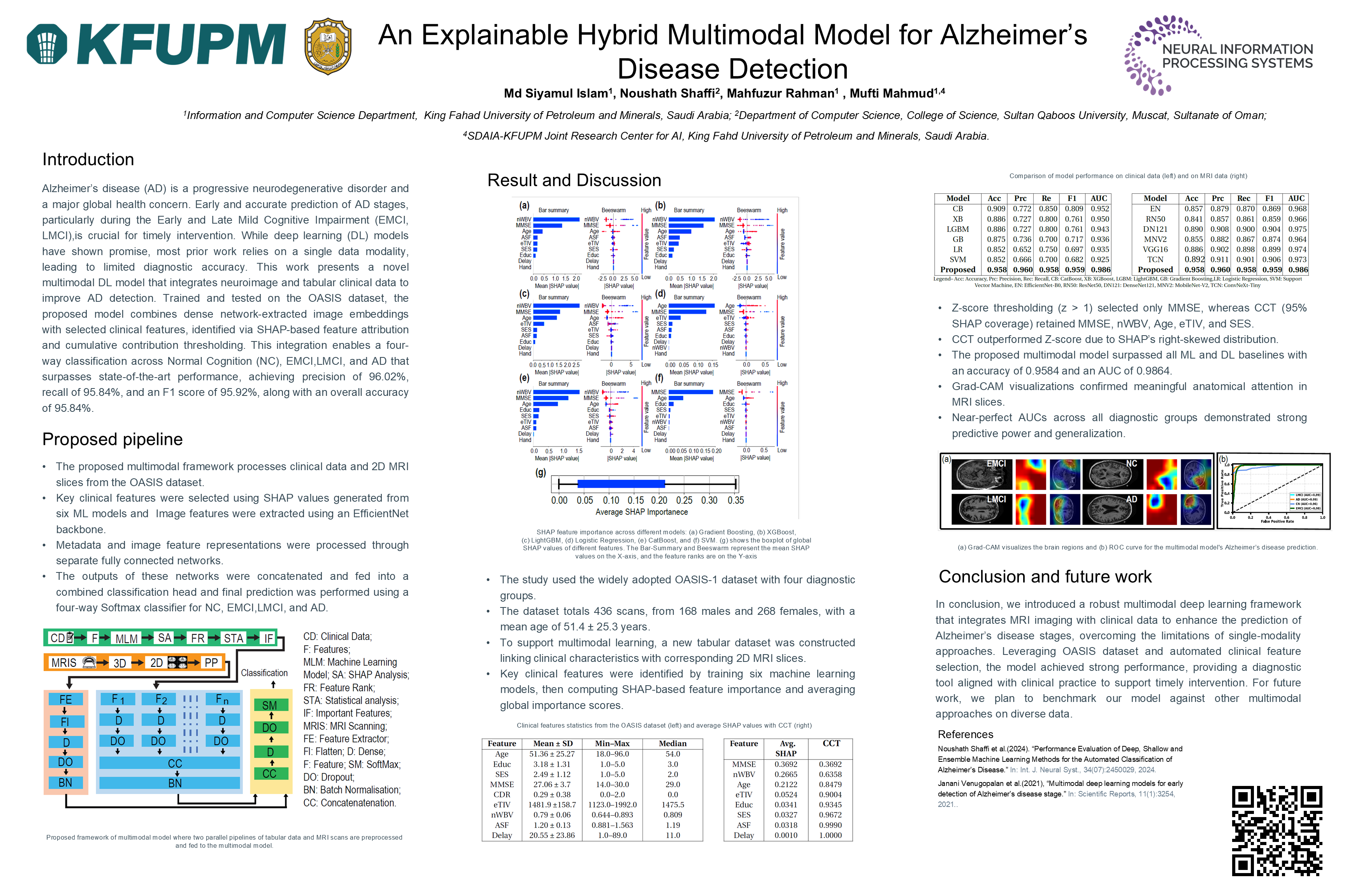 Alzheimer’s disease (AD) is a progressive neurodegenerative disorder and a major global health concern. Early and accurate prediction of AD stages, particularly during the Early and Late Mild Cognitive Impairment (EMCI, LMCI), is crucial for timely intervention. While deep learning (DL) models have shown promise, most prior work relies on single-data modality, leading to limited diagnostic accuracy. This work presents a novel multimodal DL model that integrates neuroimage and tabular clinical data to improve AD detection. Trained and tested on the OASIS dataset, the proposed model combines the extracted embeddings from the image data through a dense network with selected clinical features, identified via SHAP-based feature attribution and cumulative contribution thresholding. This integration enables a four-way classification across Normal Cognition (NC), EMCI, LMCI, and AD that surpasses the state-of-the-art performance with a precision of 96.02%, a recall of 95.84%, and an F1 score of 95.92%, alongside an overall accuracy of 95.84%.