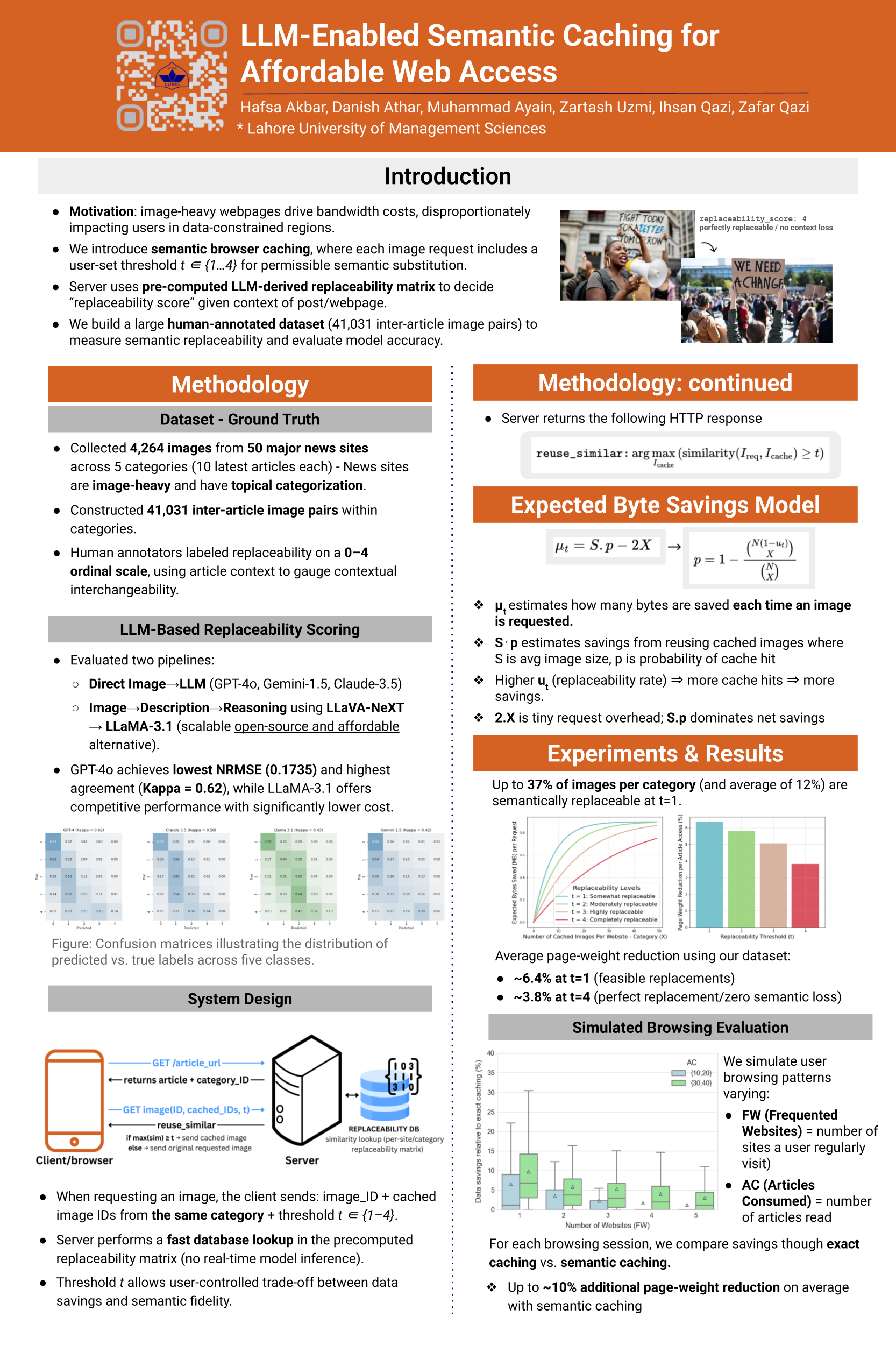 The rapid growth of web content has led to increasingly large webpages, posing significant challenges for Internet affordability, especially in developing countries where data costs remain prohibitively high. We propose semantic caching using Large Language Models (LLMs) exclusively at server-side to improve web affordability by enabling reuse of semantically similar images within webpages. Analyzing 50 leading news and media websites, encompassing 4,264 images and over 40,000 image pairs, we demonstrate potential for significant data transfer reduction, with some website categories showing up to 37% of images as replaceable. Our proof-of-concept architecture shows users can achieve approximately 10% greater byte savings compared to exact caching. We evaluate both commercial and open-source multi-modal LLMs for assessing semantic replaceability. GPT-4o performs best with a low Normalized Root Mean Square Error of 0.1735 and a weighted F1 score of 0.8374, while the open-source LLaMA 3.1 model shows comparable performance, highlighting its viability for large-scale applications. This approach offers benefits for both users and website operators, substantially reducing data transmission.
