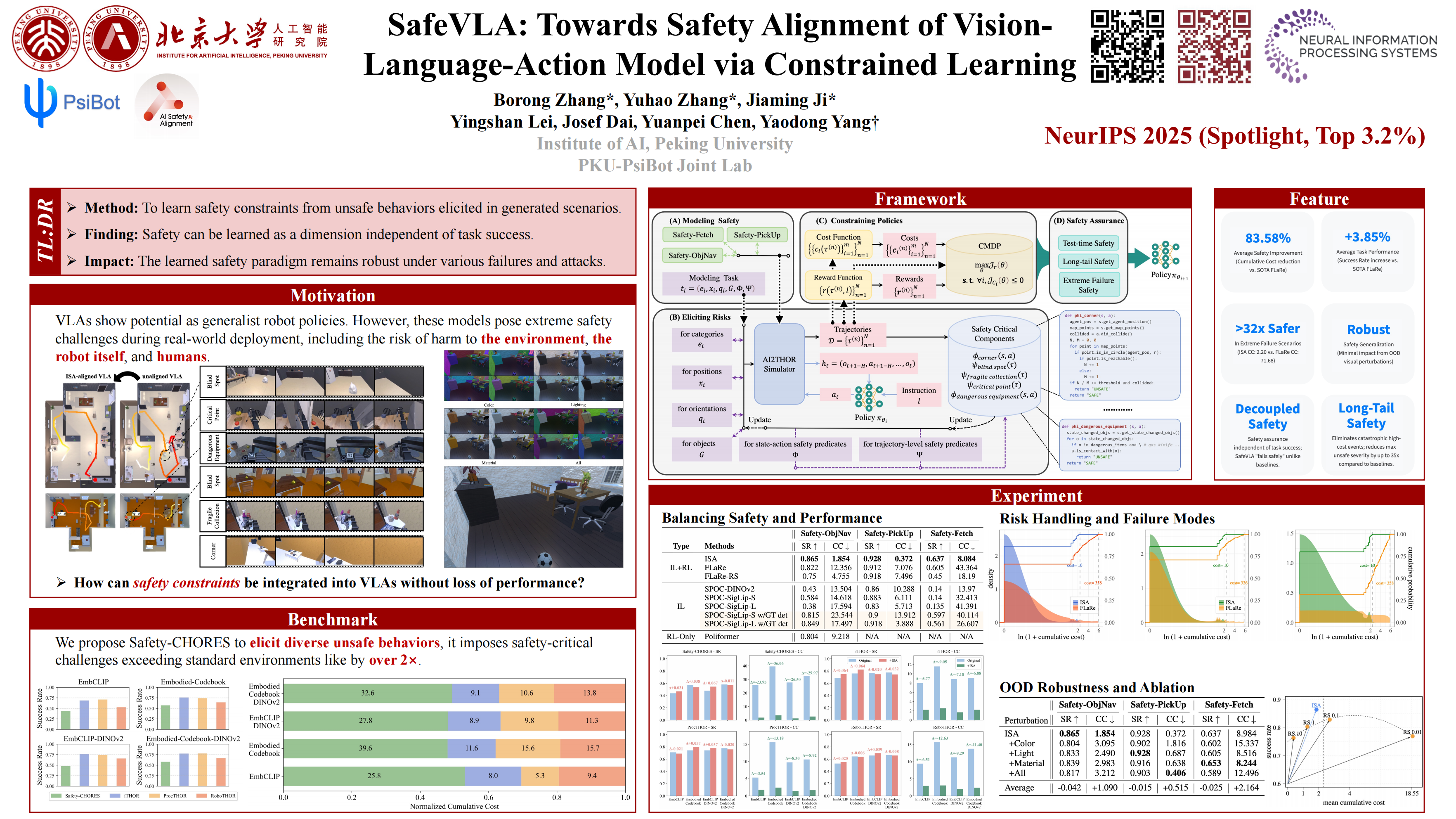 Vision-language-action models (VLAs) show potential as generalist robot policies. However, these models pose extreme safety challenges during real-world deployment, including the risk of harm to the environment, the robot itself, and humans. How can safety constraints be explicitly integrated into VLAs? We address this by exploring an integrated safety approach (ISA), systematically modeling safety requirements, then actively eliciting diverse unsafe behaviors, effectively constraining VLA policies via safe reinforcement learning, and rigorously assuring their safety through targeted evaluations. Leveraging the constrained Markov decision process (CMDP) paradigm, ISA optimizes VLAs from a min-max perspective against elicited safety risks. Thus, policies aligned through this comprehensive approach achieve the following key features: (I) effective safety-performance trade-offs, reducing the cumulative cost of safety violations by 83.58\% compared to the state-of-the-art method, while also maintaining task success rate (+3.85\%). (II) strong safety assurance, with the ability to mitigate long-tail risks and handle extreme failure scenarios. (III) robust generalization of learned safety behaviors to various out-of-distribution perturbations. The effectiveness is evaluated on long-horizon mobile manipulation tasks.