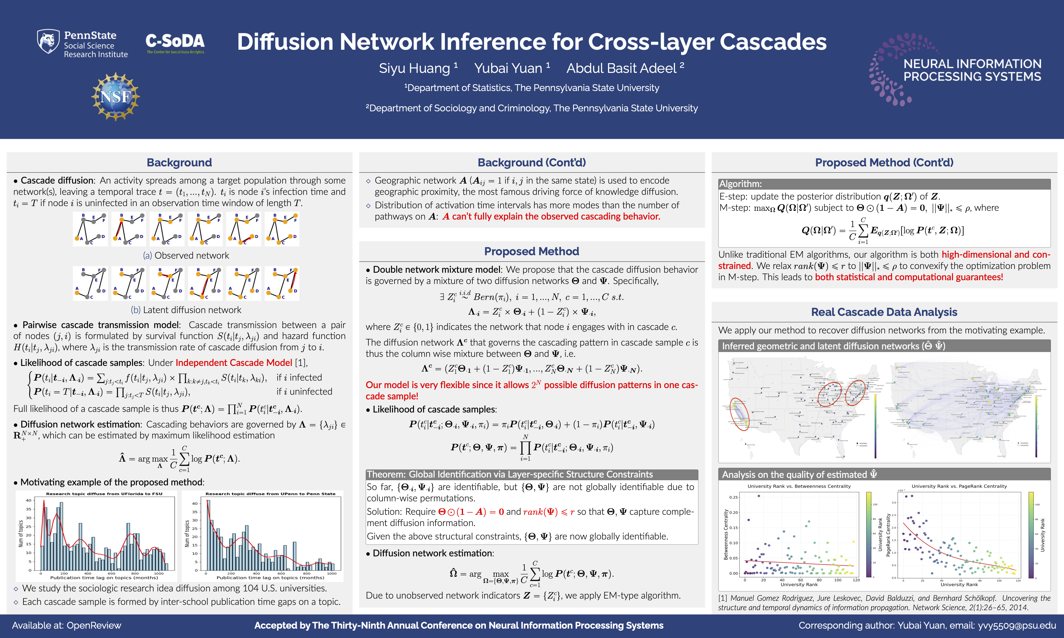 A cascade over a network refers to the diffusion process where behavior changes occurring in one part of an interconnected population lead to a series of sequential changes throughout the entire population. In recent years, there has been a surge in interest and efforts to understand and model cascade mechanisms since they motivate many significant research topics across different disciplines. The propagation structure of cascades is governed by underlying diffusion networks that are often hidden. Inferring diffusion networks thus enables interventions in cascading process to maximize information propagation and provides insights into the Granger causality of interaction mechanisms among individuals. In this project, we propose a novel double network mixture model for inferring latent diffusion network in presence of strong cascade heterogeneity. The new model represents cascade pathways as a distributional mixture over diffusion networks that capture different cascading patterns at the population level. We develop a data-driven optimization method to infer diffusion networks using only visible temporal cascade records, avoiding the need to model complex and heterogeneous individual states. Both statistical and computational guarantees are established for the proposed method. We apply the proposed model to analyze research topic cascades in social sciences across U.S. universities and uncover the latent research topic diffusion network among top U.S. social science programs.